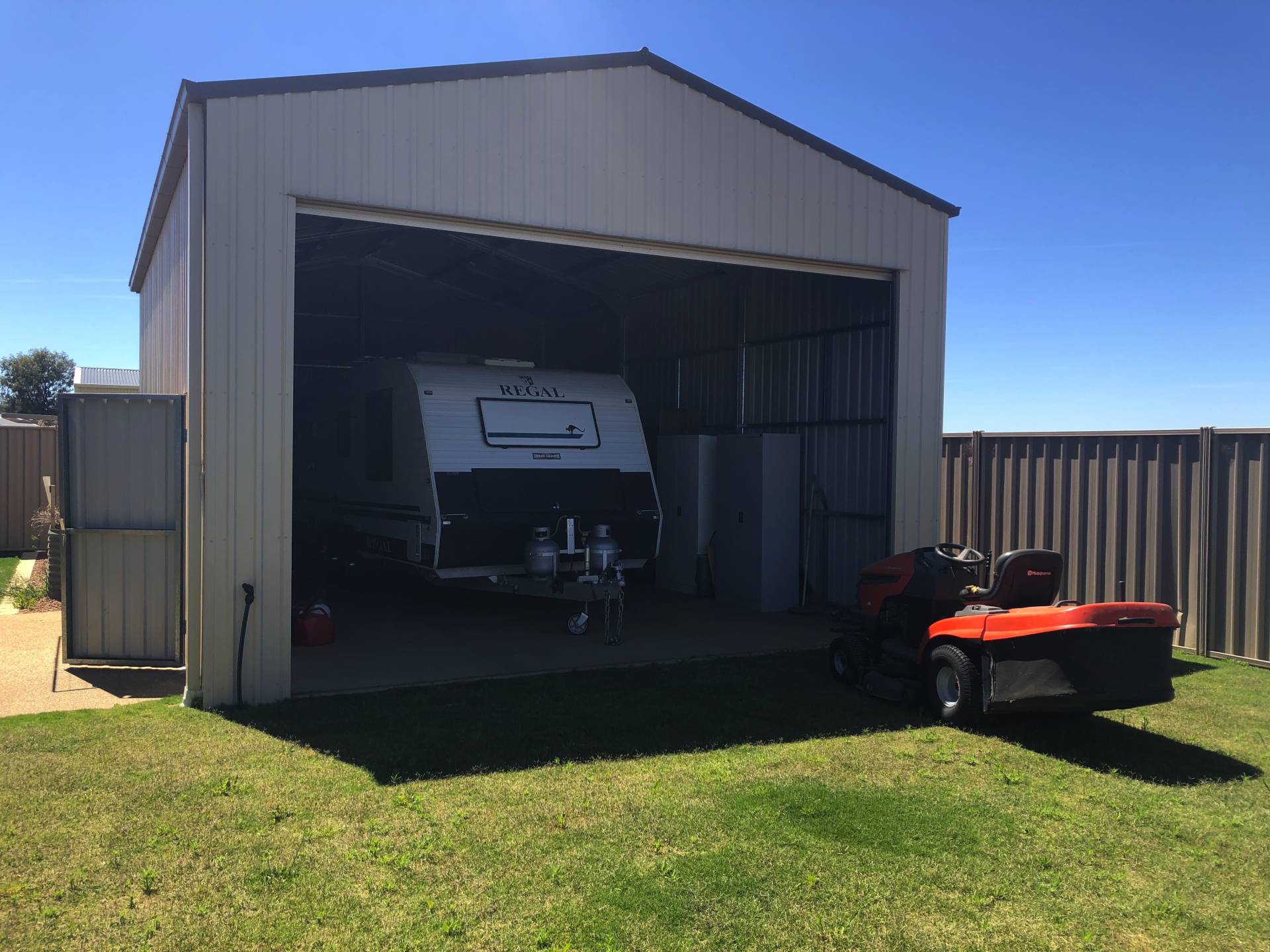 -Impressive shed approx 5x8m, high roof, roller door, concrete floor and power. Rear access.