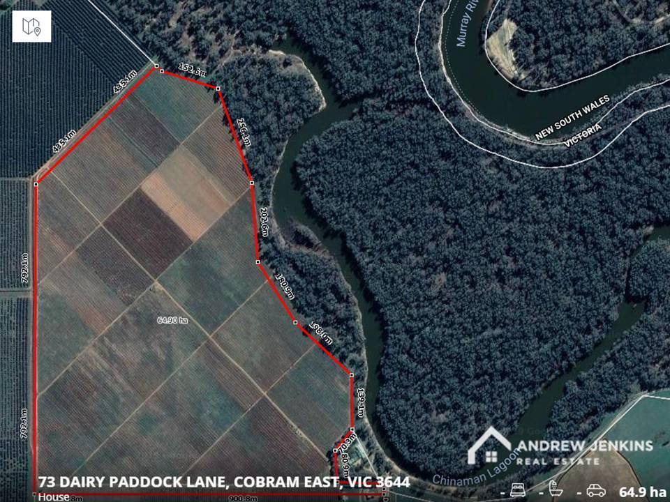 Rare water front land situated between Cobram and Yarrawonga beside the Mighty Murray River.  160 acres currently under orchard (including cherries).  It has several excellent home sites with water frontage. (STCA)  Fronts state forest with a small beach and boat access to the Murray River. Create your dream here!  Irrigation water on the property with 320 megalitres from spear point and 158 megalitre delivery share from the creek with pump.  Irrigation pipes throughout the property.  Possible subdivision potential (STCA). Excellent soils. Keep the orchard for some income or lifestyle block, hobby farm. Choices galore.  A rare opportunity to purchase a waterfront property.