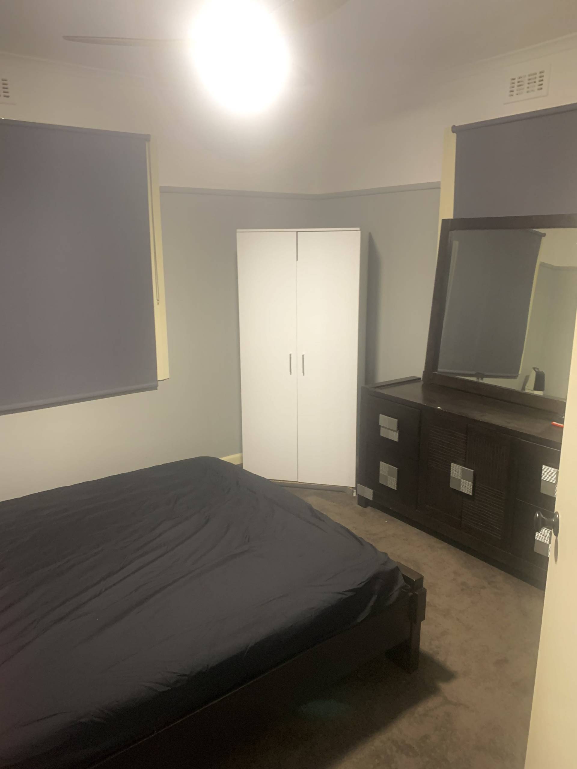 Main bedroom with ceiling fan, carpet and free standing cupboard