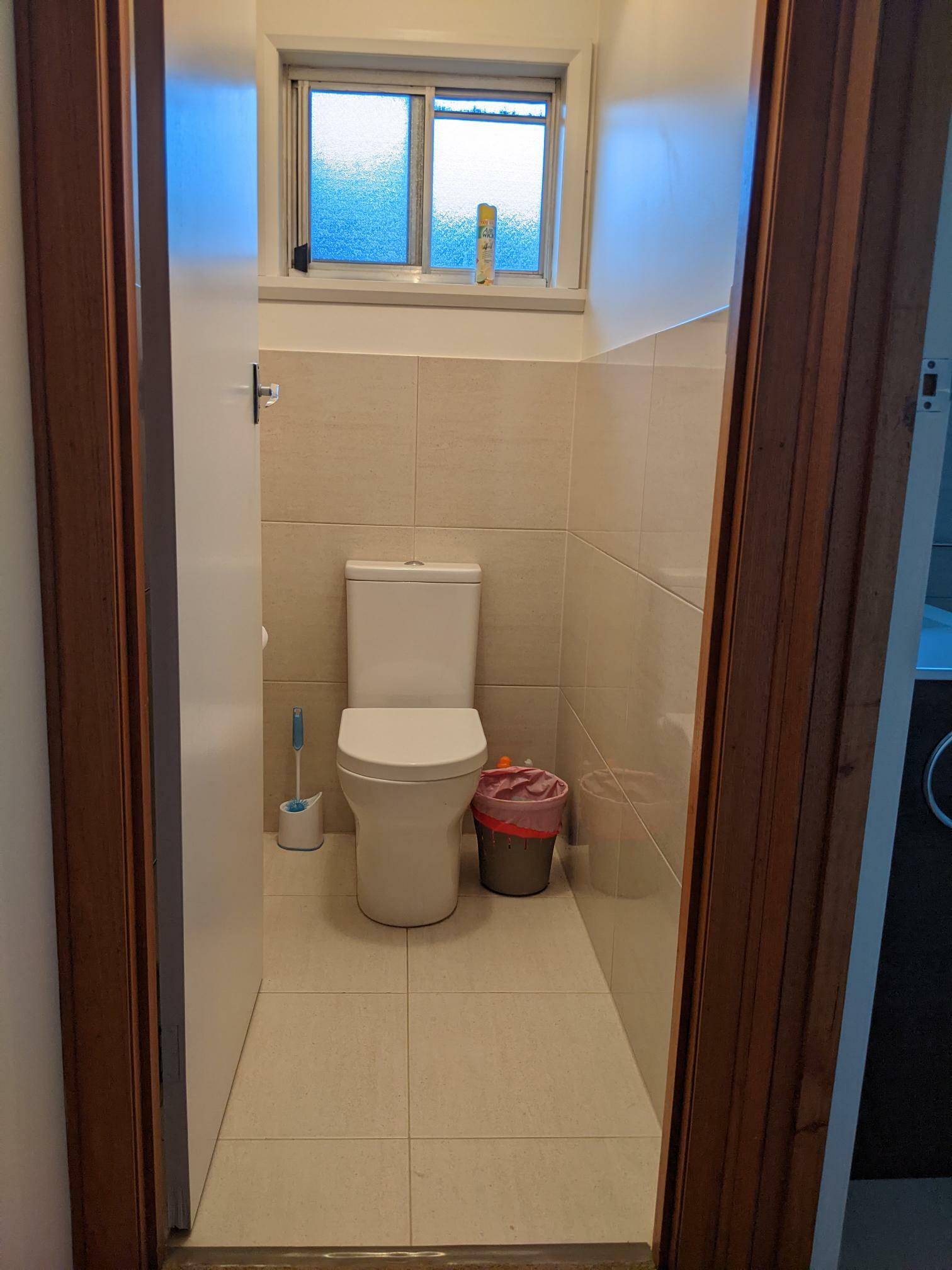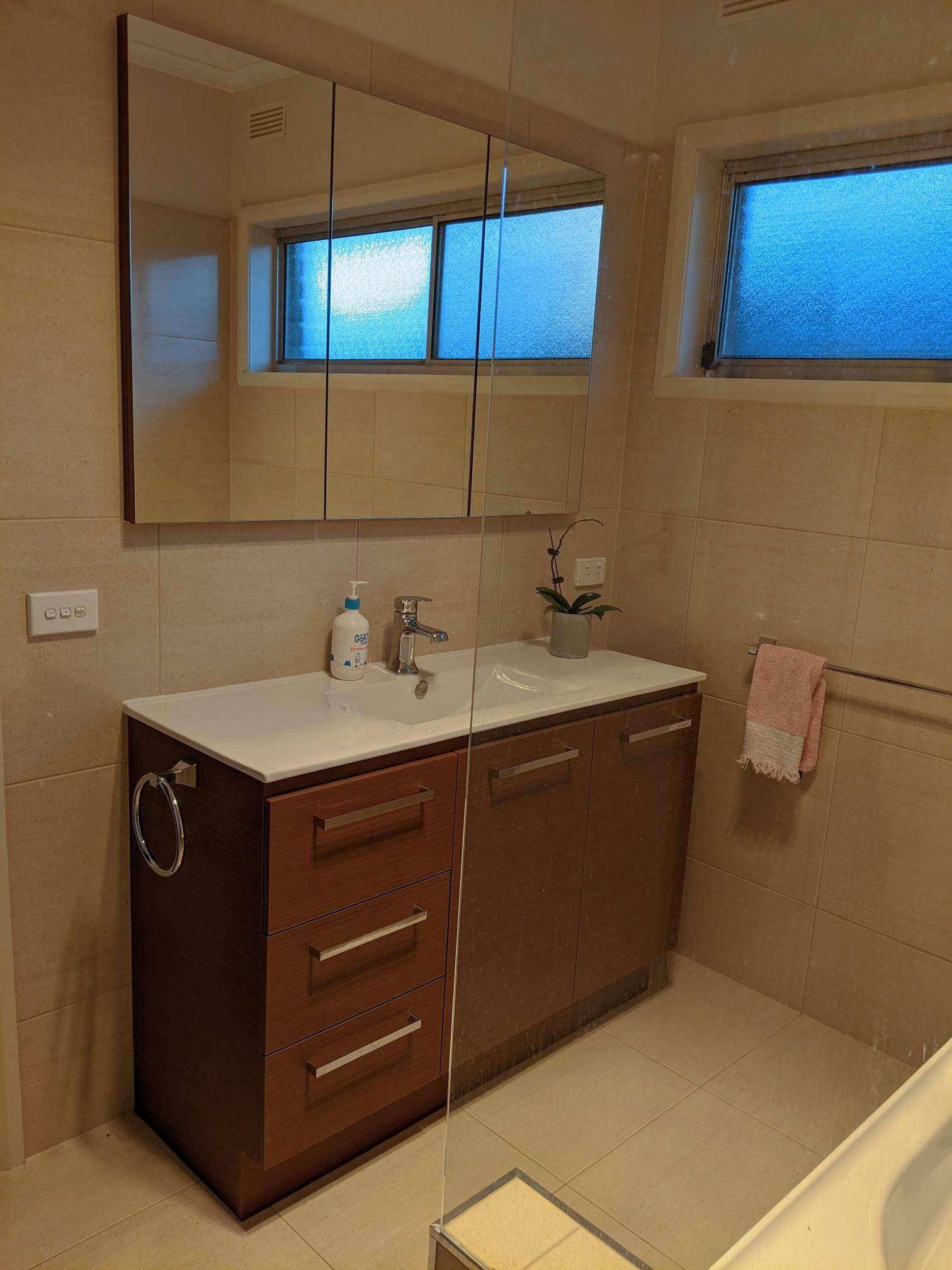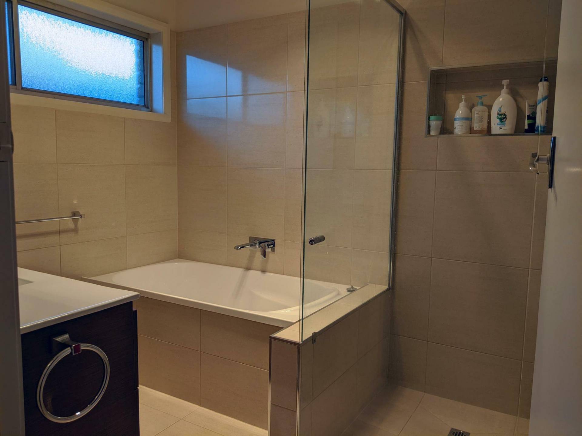 ~Renovated bathroom with bath, vanity and shower. Separate toilet. Good size laundry.
