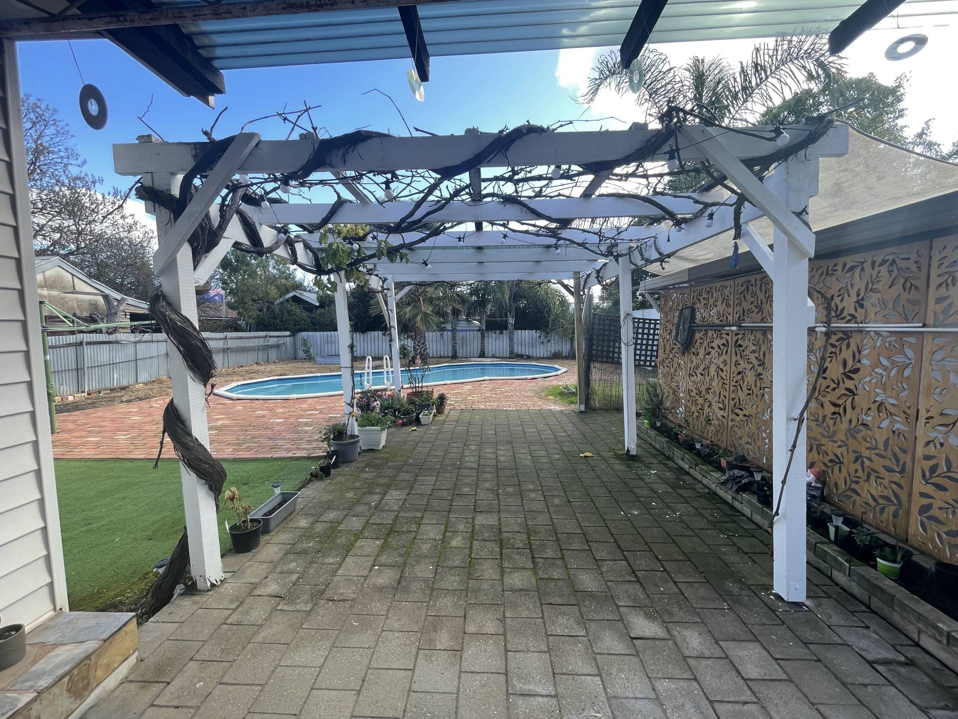 Large Paved patio area, single garage, single carport and sundry shedding approx 3.8x3.8m. inground pool (awaiting pool cert re: fencing requirements, this will be sorted prior to a tenant commencing)