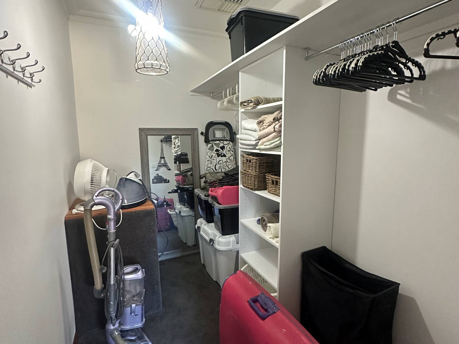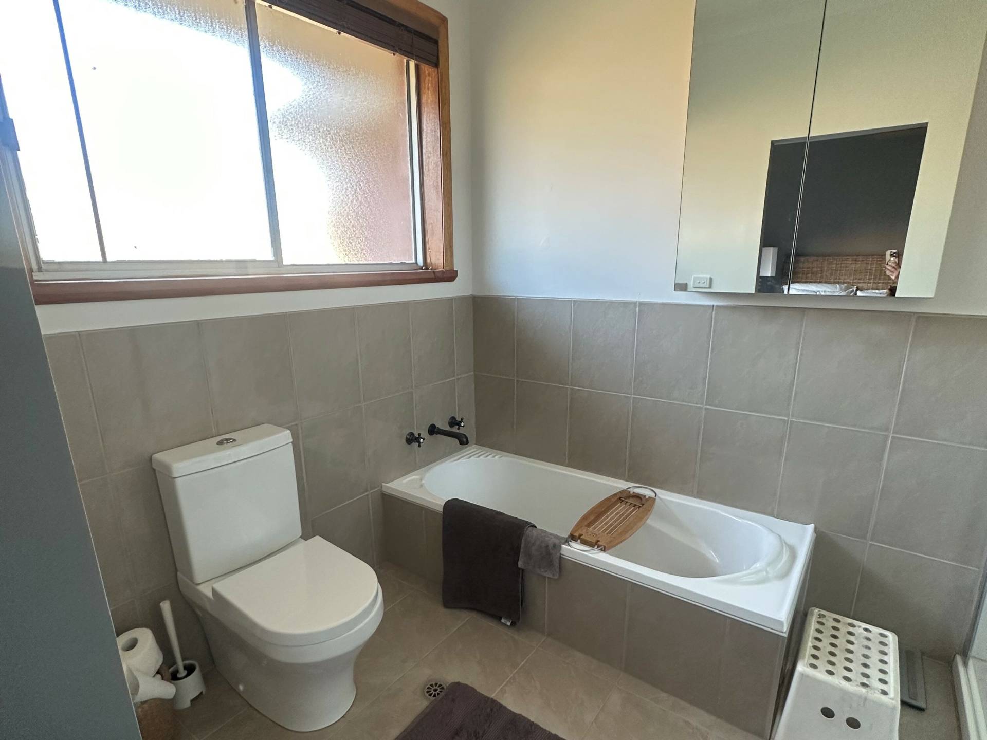 Main bedroom has large walk-in robe and ensuite with shower, toilet, bath and vanity. Bedroom two with add on study room with shelving, hanging space and ceiling fan. Bedroom three with own toilet and access to backyard. Main bathroom/laundry combined with trough, vanity, shower over bath and toilet.