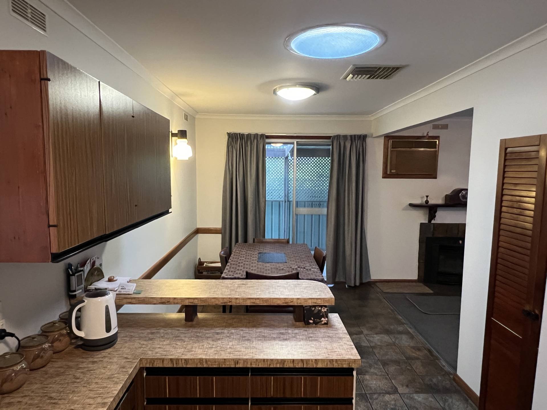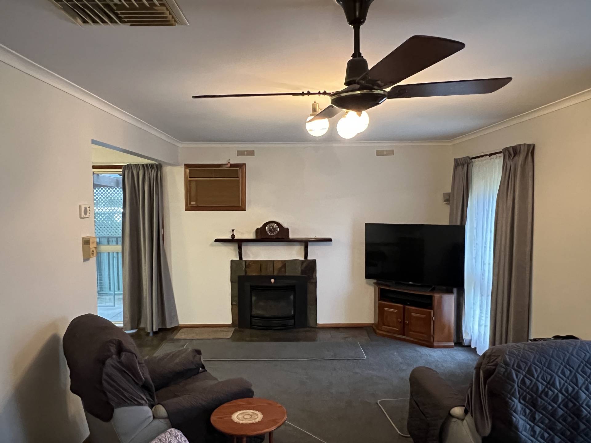 The heart of the home is the well-appointed kitchen, which includes a breakfast bar and opens directly to an inviting entertaining area. Adjacent is a good-sized lounge with a cozy gas log fire, perfect for relaxing on cooler evenings.