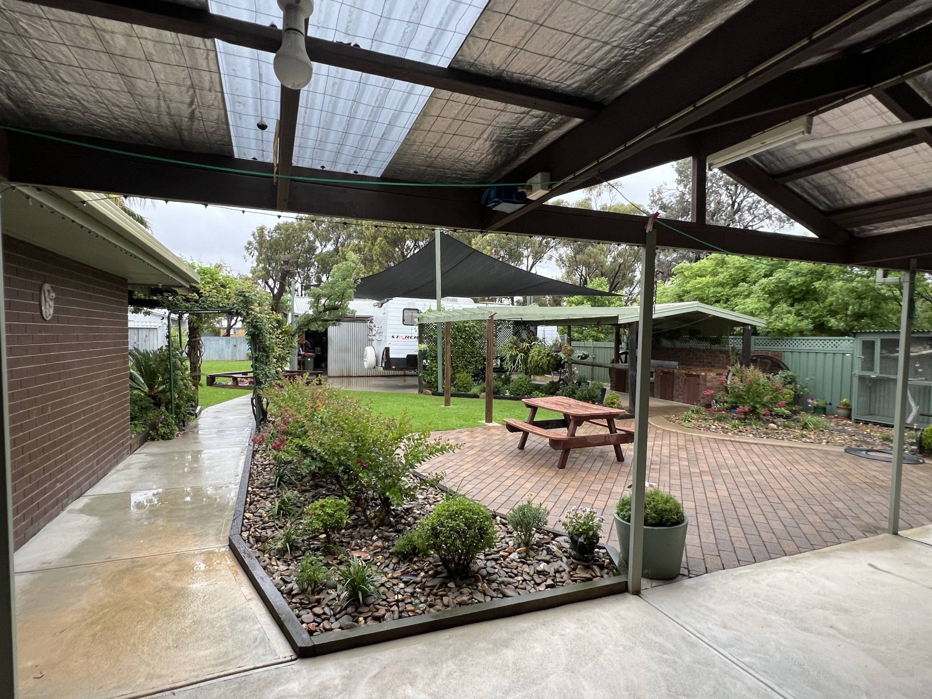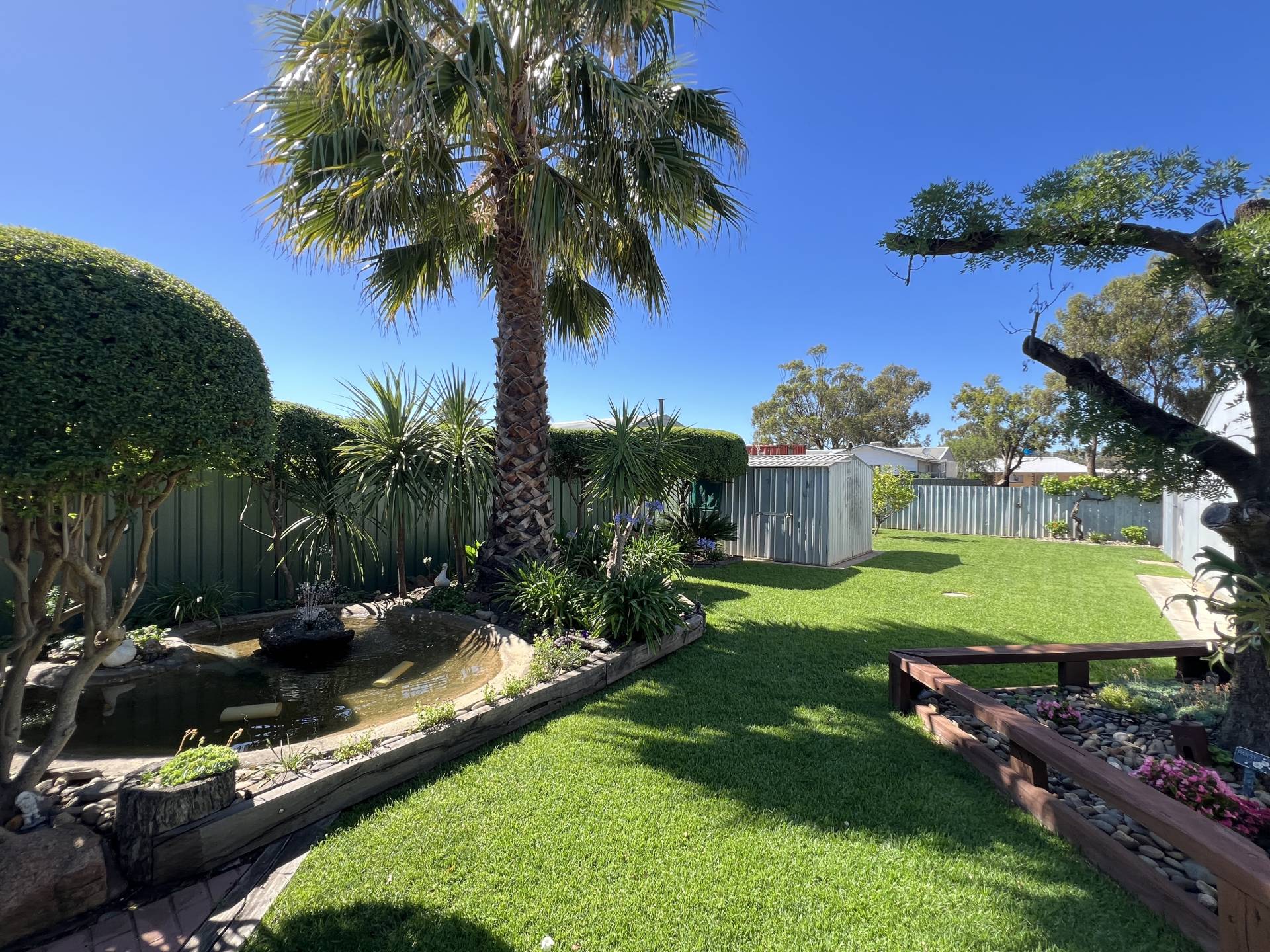 There’s even provision for caravan or boat parking, complete with a shade sail for added protection. The beautifully landscaped garden, with its tranquil filtered fishpond, provides a serene backdrop to this stunning home.