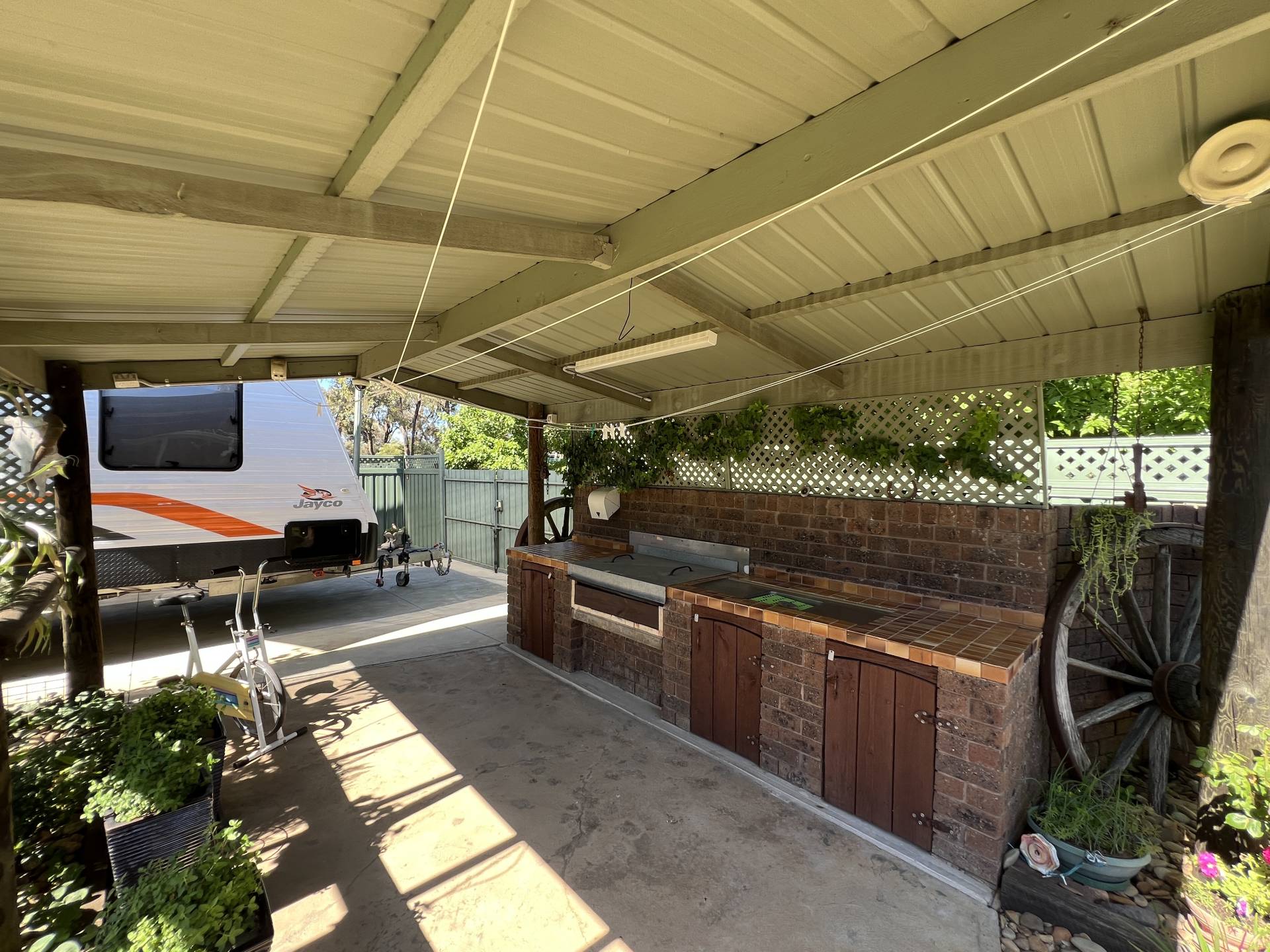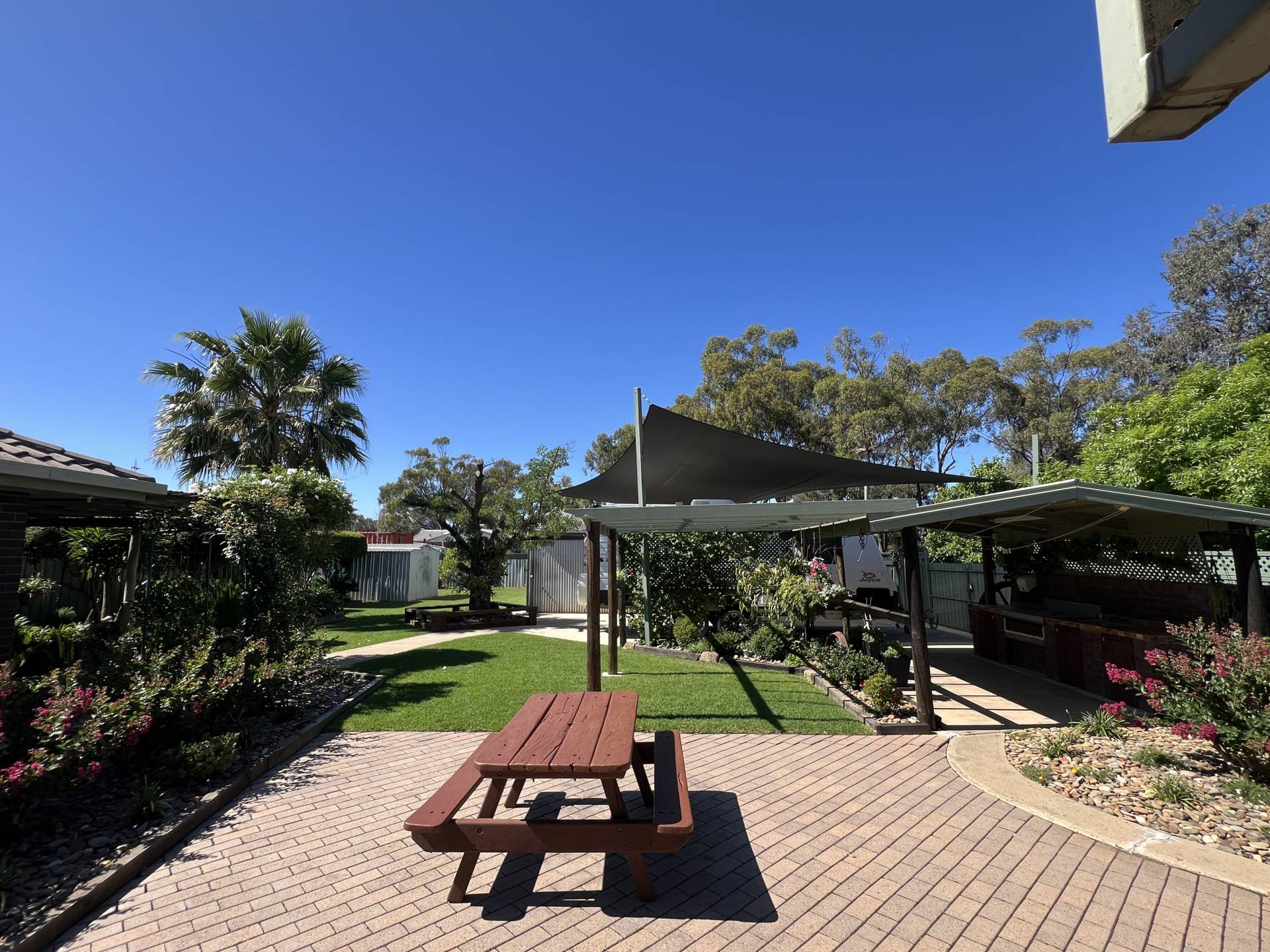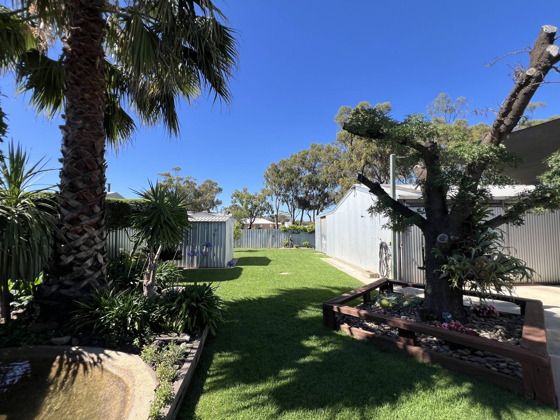 Stepping outside, the property continues to impress. A paved patio and a covered BBQ area create the ultimate setting for entertaining or unwinding. For those with hobbies or storage needs, the shedding is second to none. A 6.4m x 9.3m lockup shed with a concrete floor and power is ideal for larger projects, while a second 4m x 9.3m lockup shed and a smaller garden shed offer additional storage options.