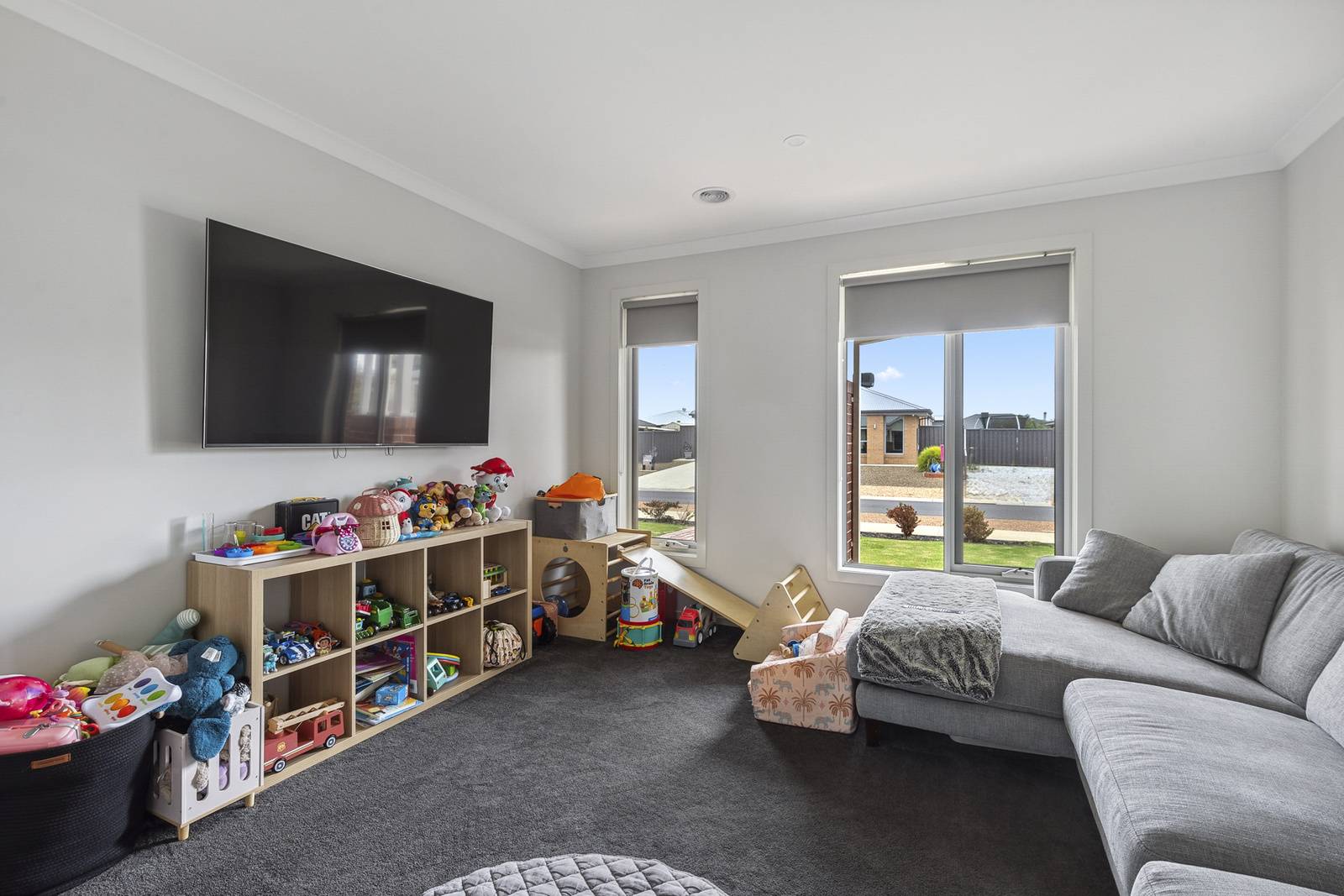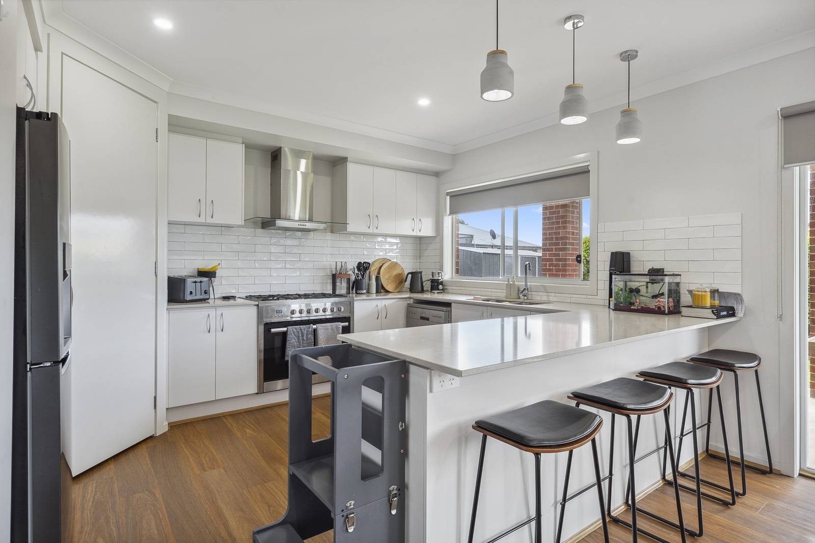 The open-plan kitchen, meals, and living area is designed for both practicality and style, featuring a 900mm gas cooktop and electric oven, a dishwasher, stone benchtops, and an undermount double sink. A separate carpeted lounge provides additional space to unwind.