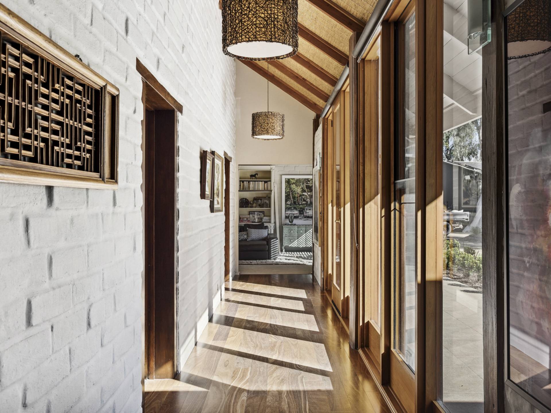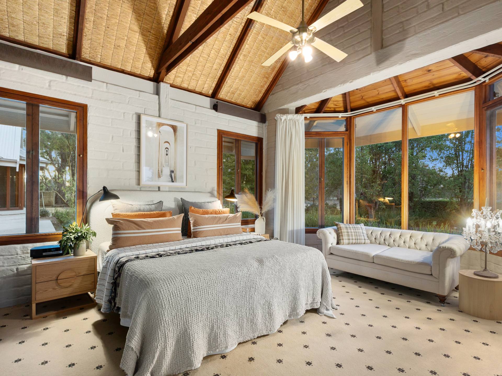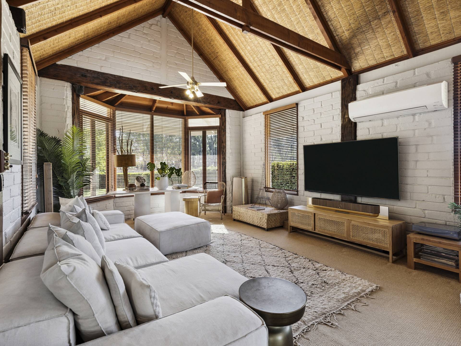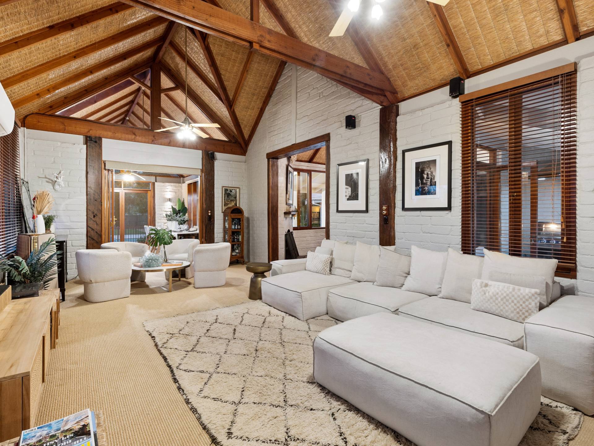 The mud brick home showcases timeless character and craftsmanship, featuring natural lighting, cedar windows, 40-degree pitched roof, and breathtaking Solomit thatched ceilings throughout. Exposed beams throughout the home are sourced from all over Australia, including reclaimed wharf timbers, adding to the home's unique charm.