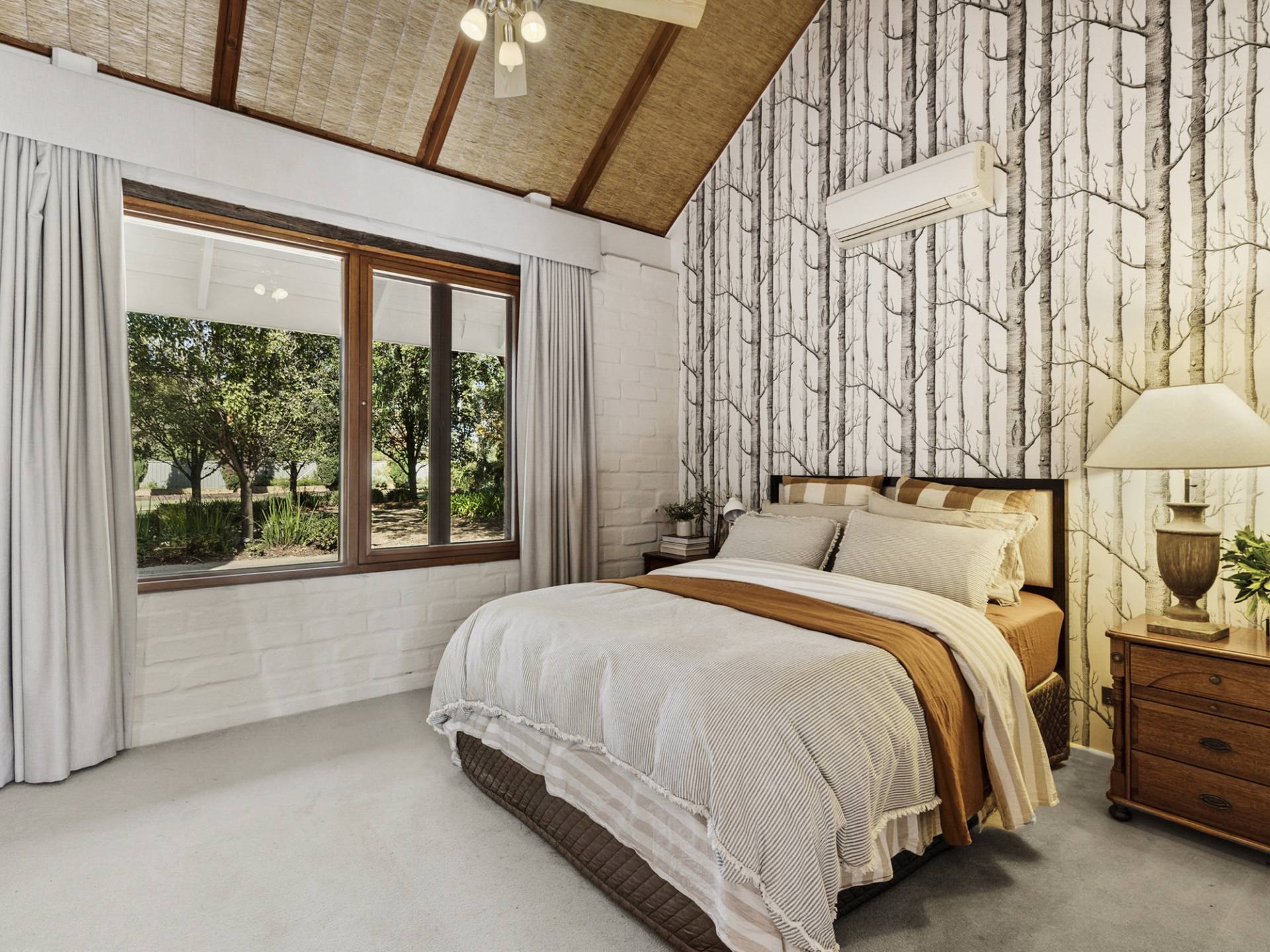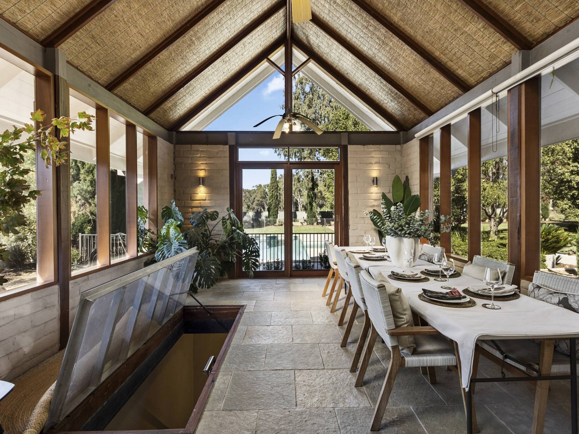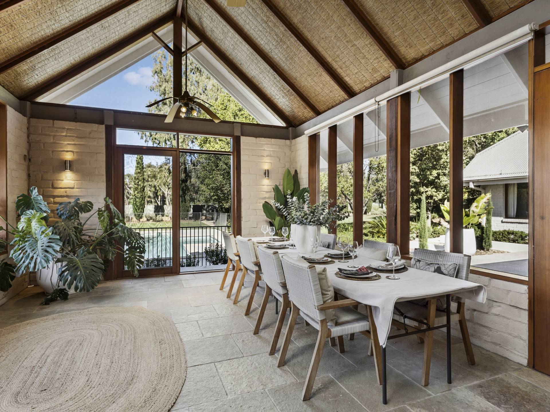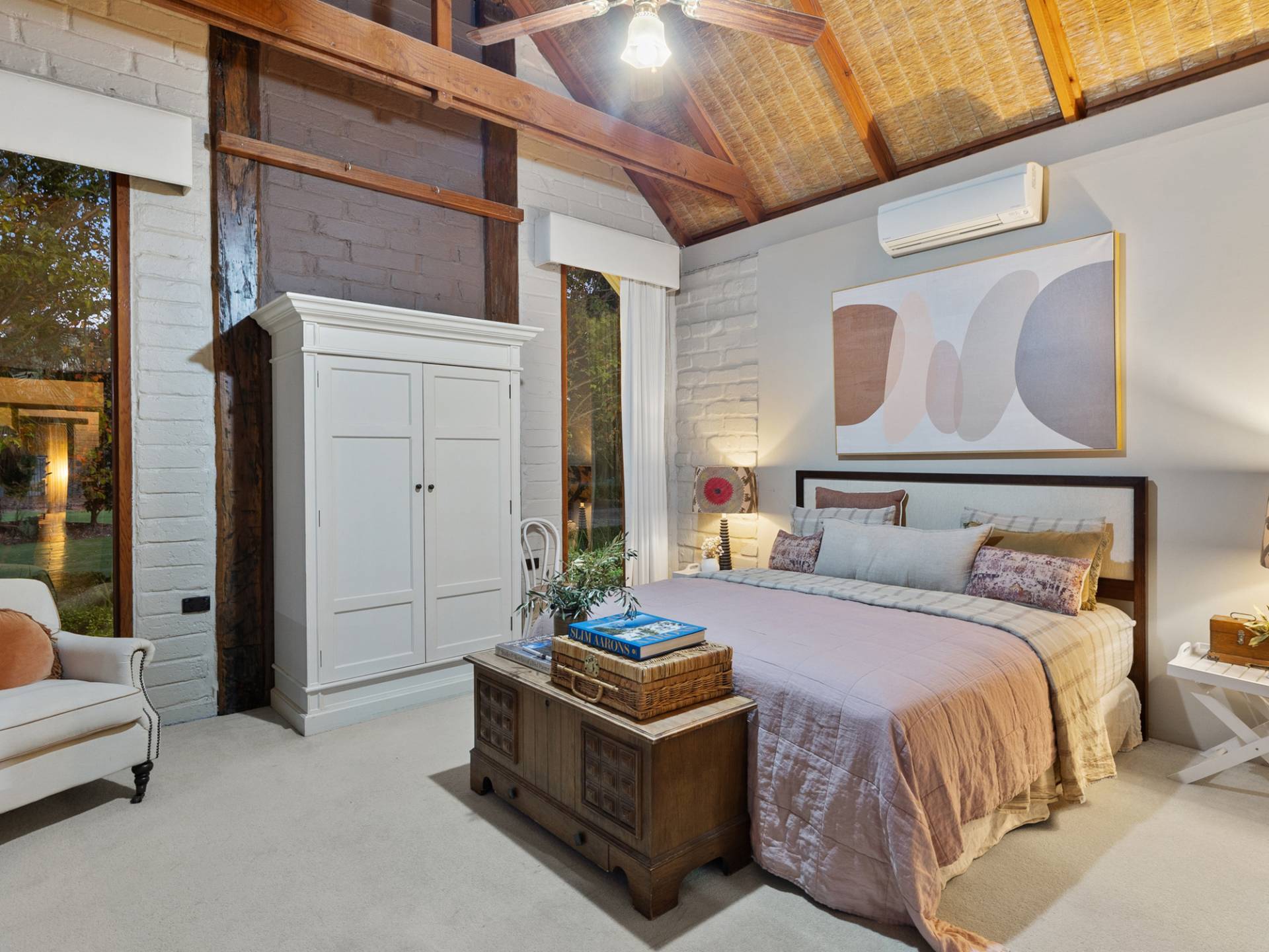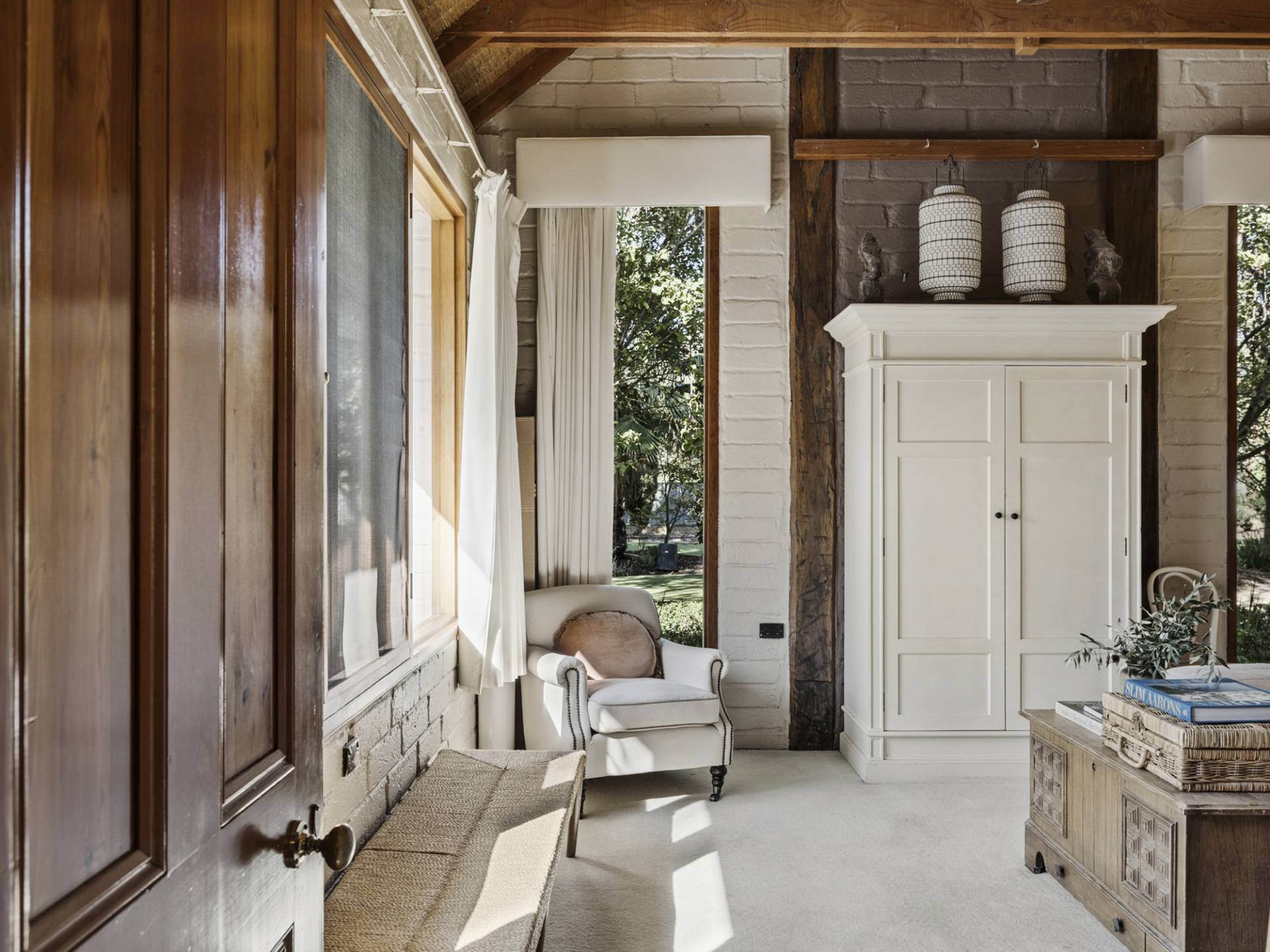 The mud brick home showcases timeless character and craftsmanship, featuring natural lighting, cedar windows, 40-degree pitched roof, and breathtaking Solomit thatched ceilings throughout. Exposed beams throughout the home are sourced from all over Australia, including reclaimed wharf timbers, adding to the home's unique charm.