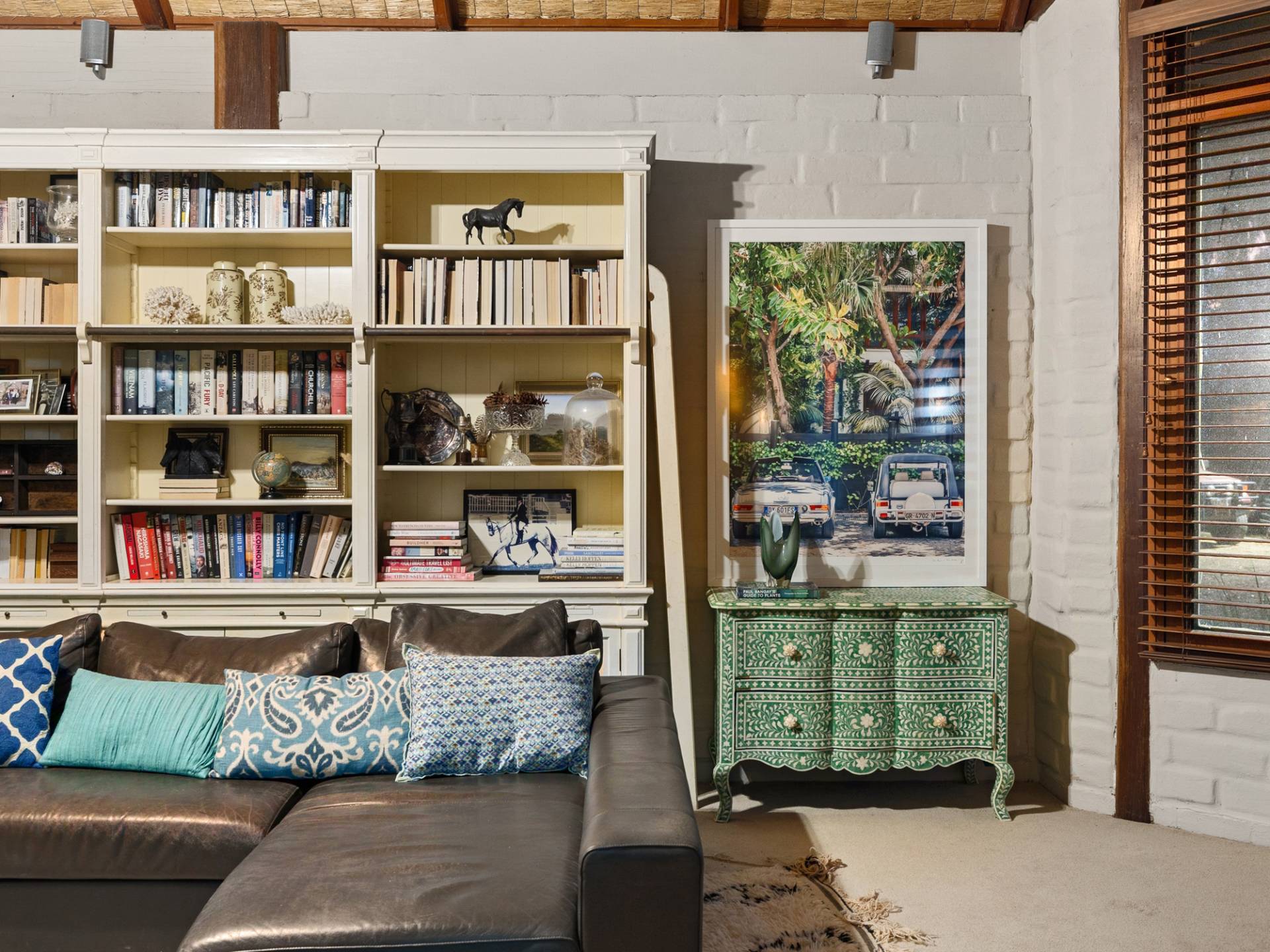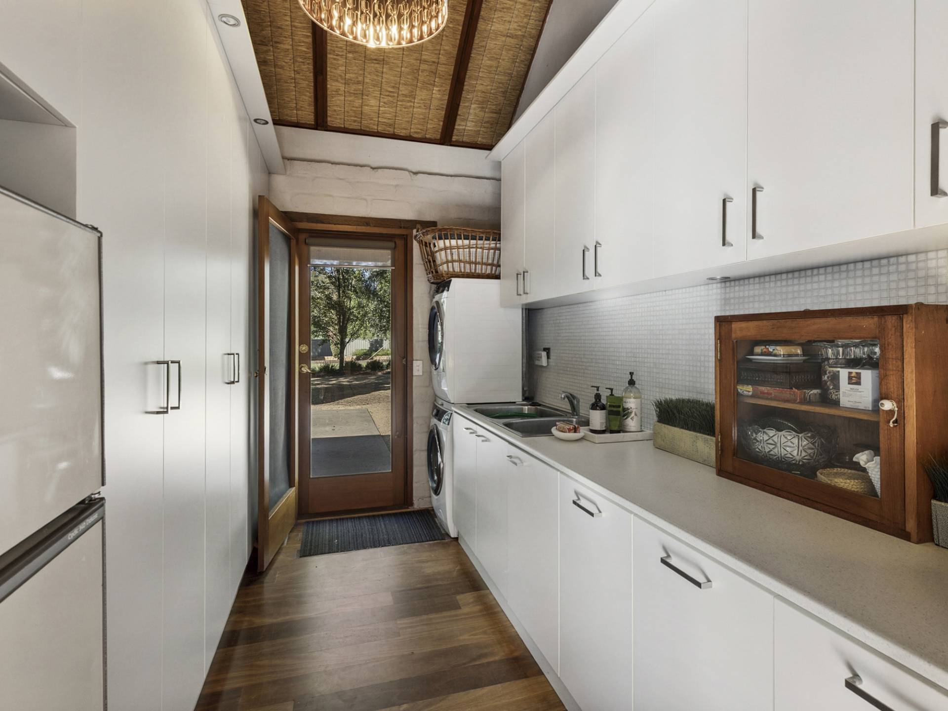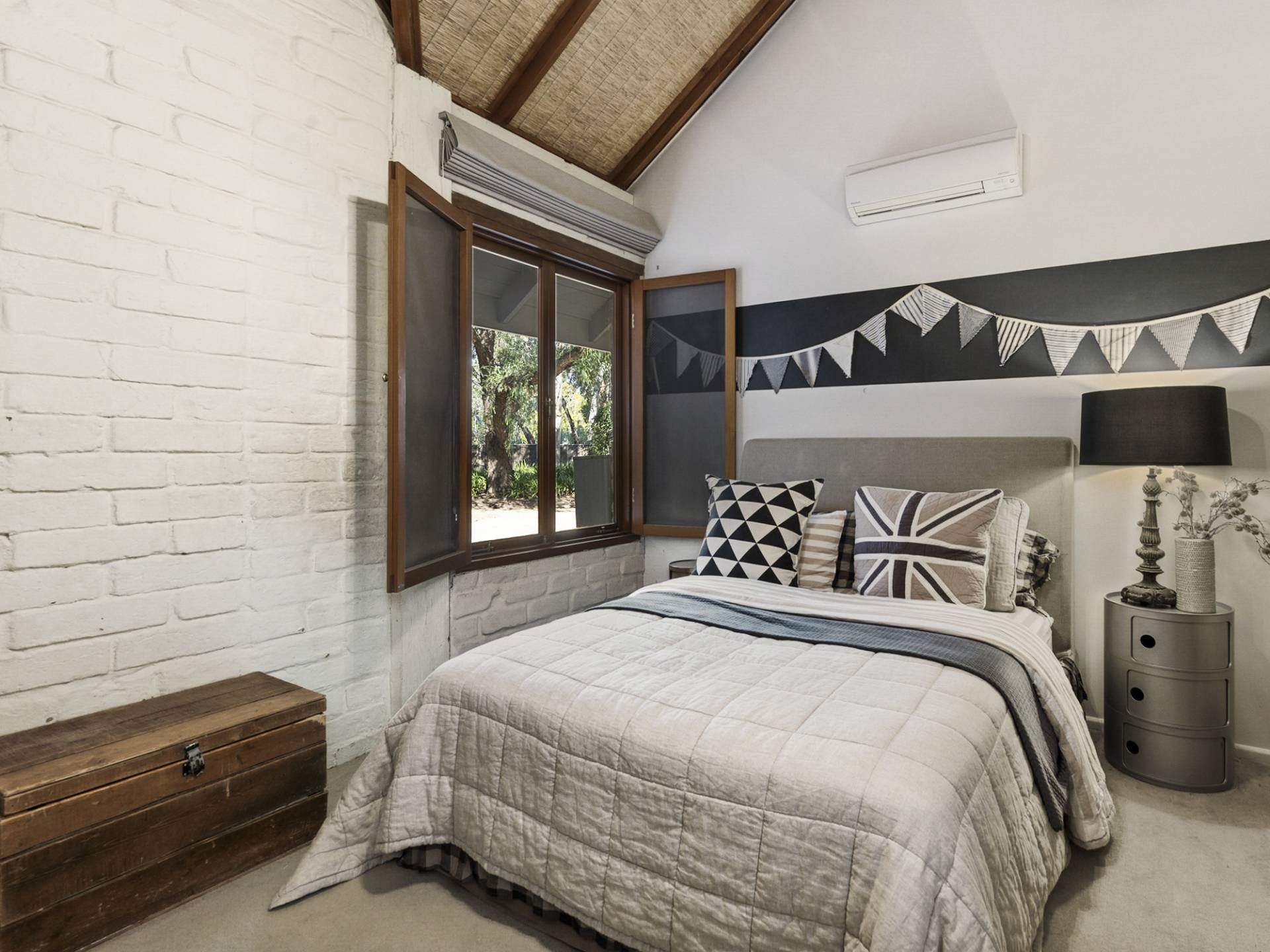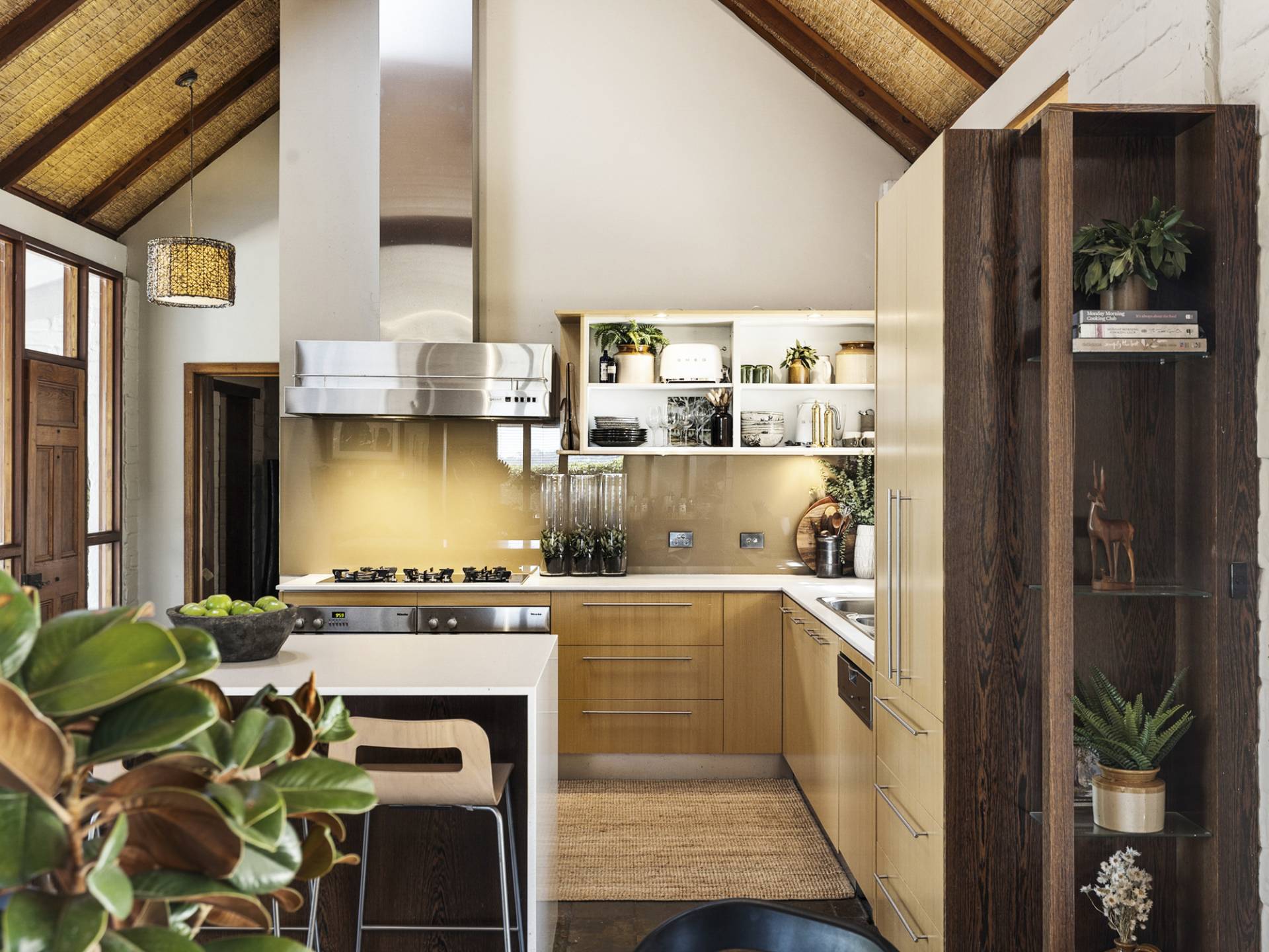 The mud brick home showcases timeless character and craftsmanship, featuring natural lighting, cedar windows, 40-degree pitched roof, and breathtaking Solomit thatched ceilings throughout. Exposed beams throughout the home are sourced from all over Australia, including reclaimed wharf timbers, adding to the home's unique charm.