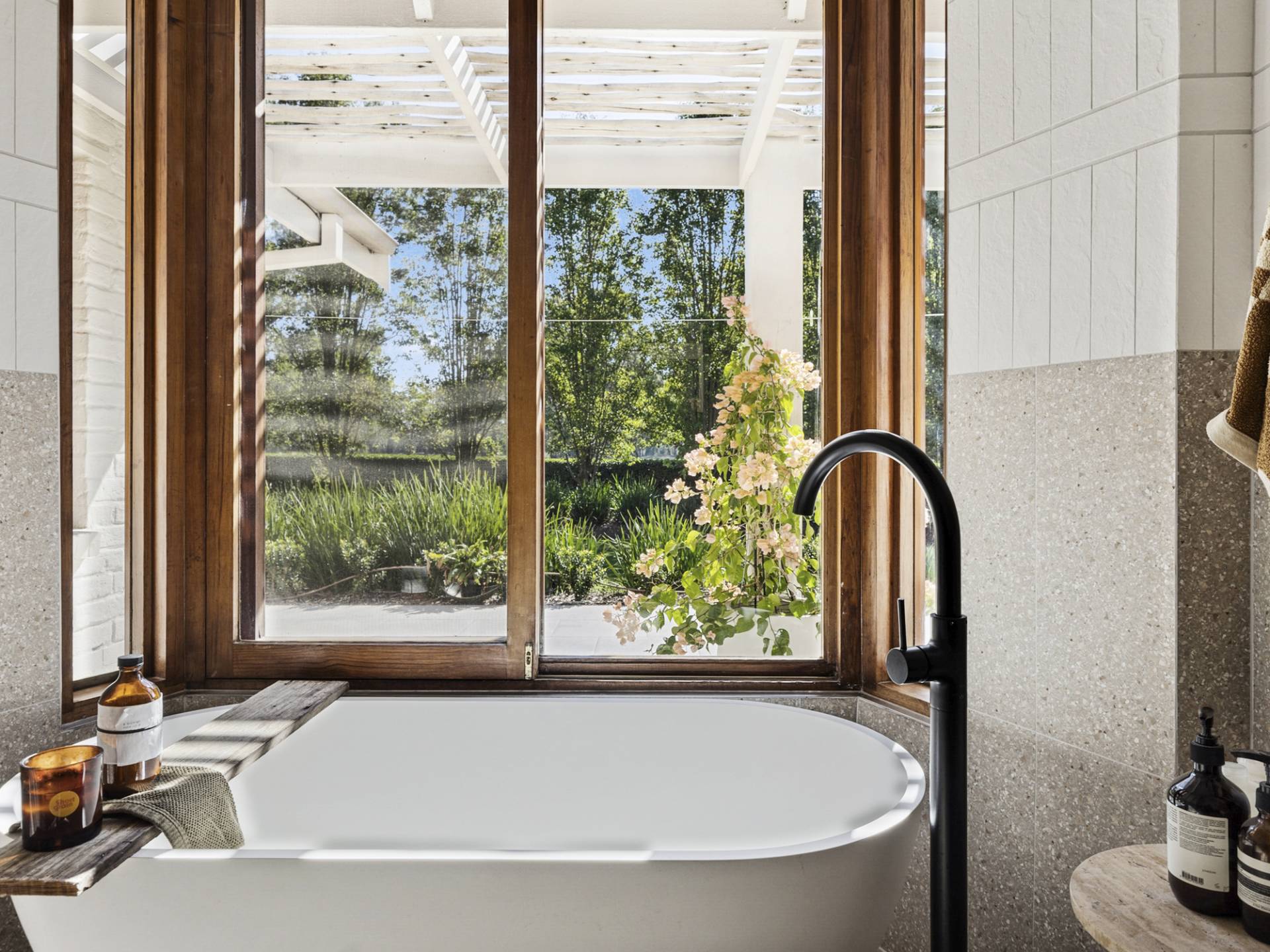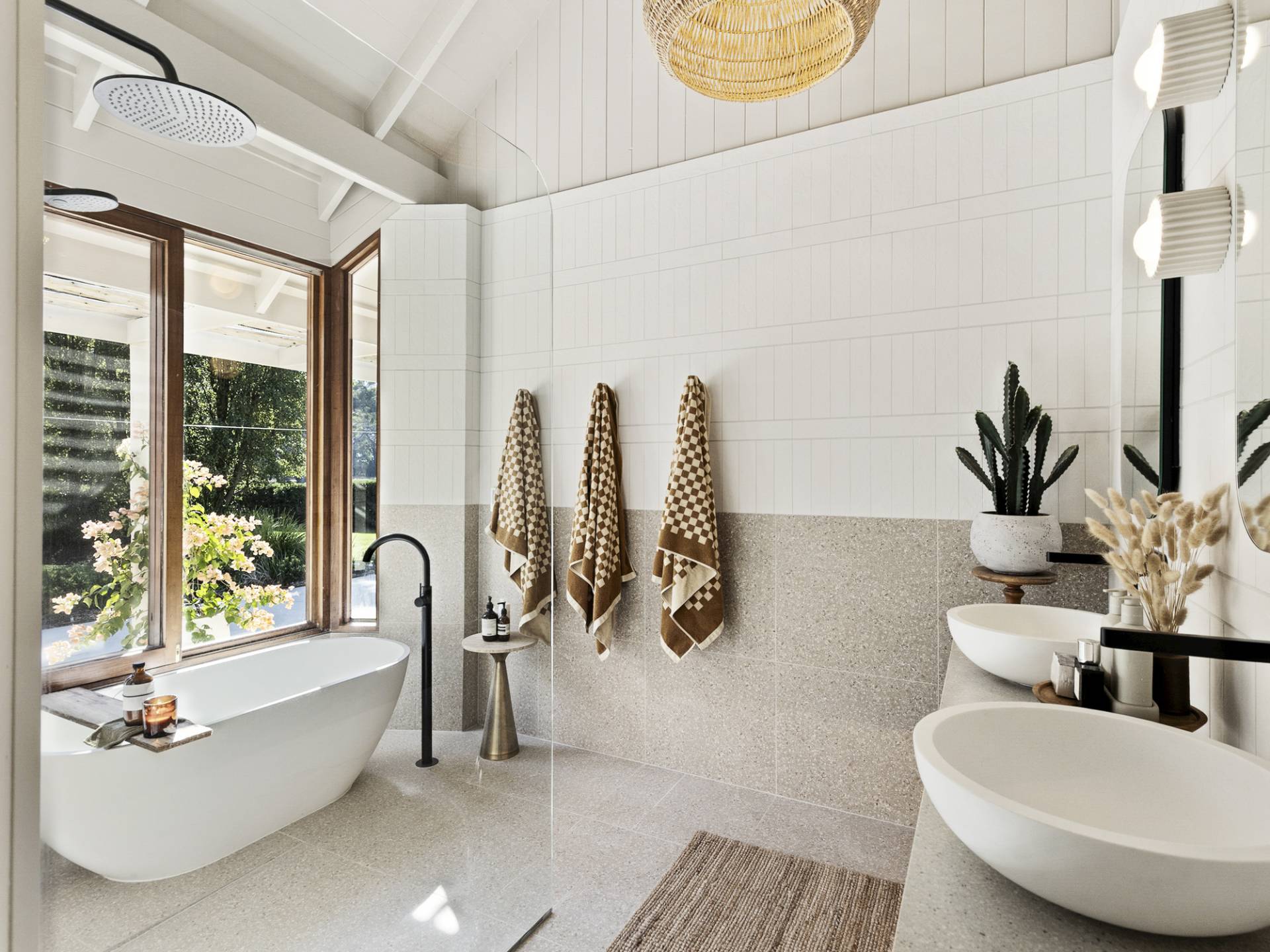 The main bathroom is filled with natural light, featuring a freestanding bath positioned in front of a large bay window and an open shower. It includes pitched ceilings, quality tiling, a twin vanity with mood lighting, heated towel rails, and floor heating. The second bathroom offers a shower, vanity, floor heating and toilet, with an additional separate toilet for added convenience.