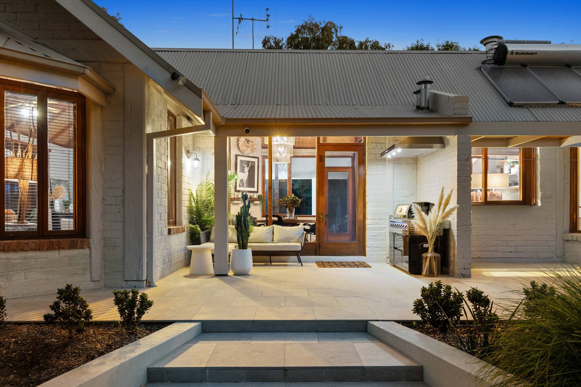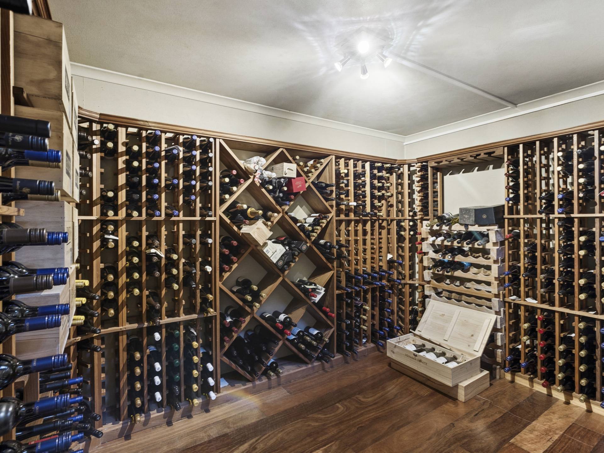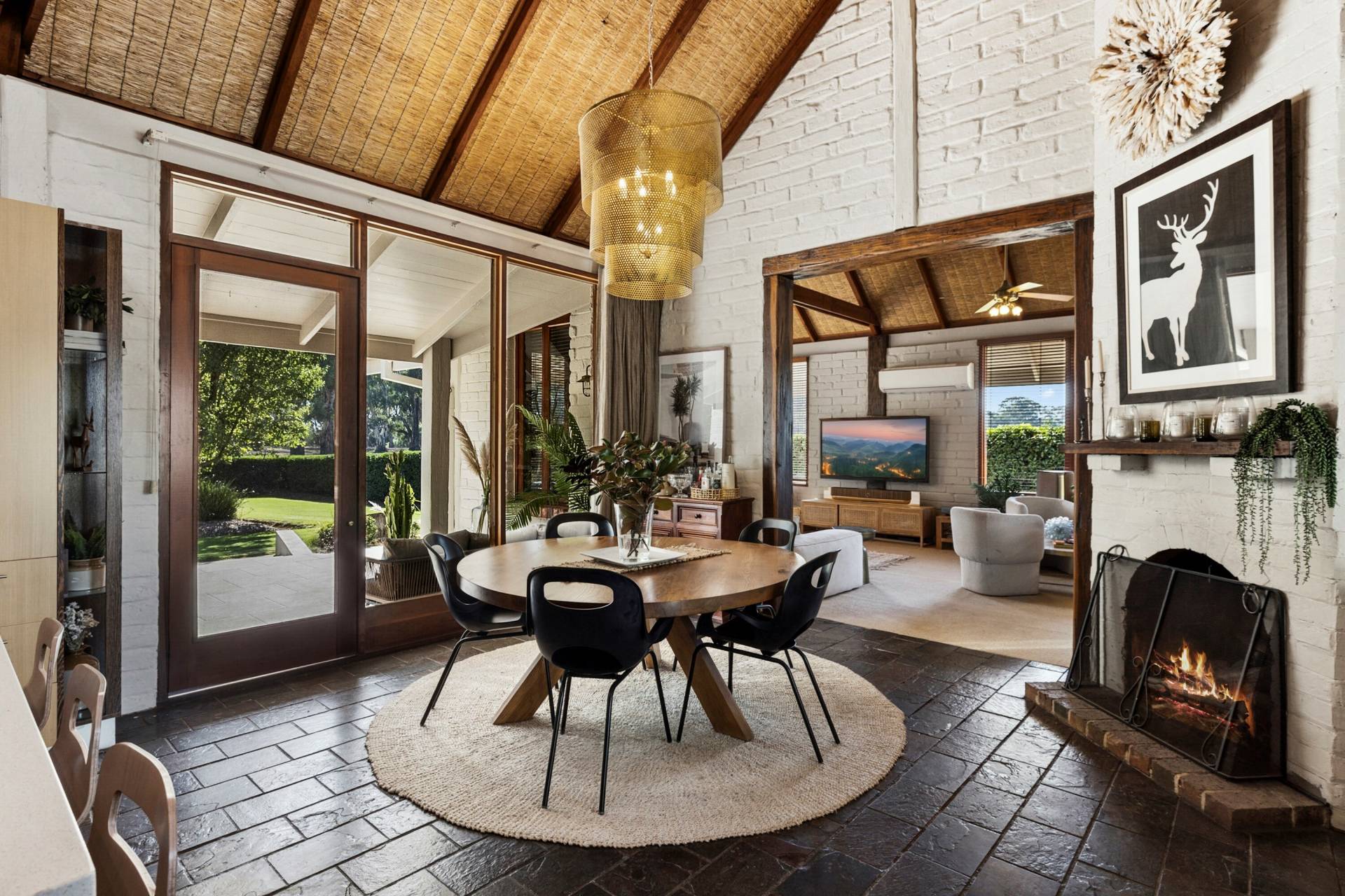 The interior blends warmth and luxury with a beautifully appointed kitchen and meals area centred around a grand open fireplace. The kitchen boasts quality appliances, stone benchtops with waterfall edges, and a walk-in pantry. There are two separate living areas, plus a versatile enclosed indoor/outdoor dining space complete with an underground cellar—making this the ultimate home for entertaining.