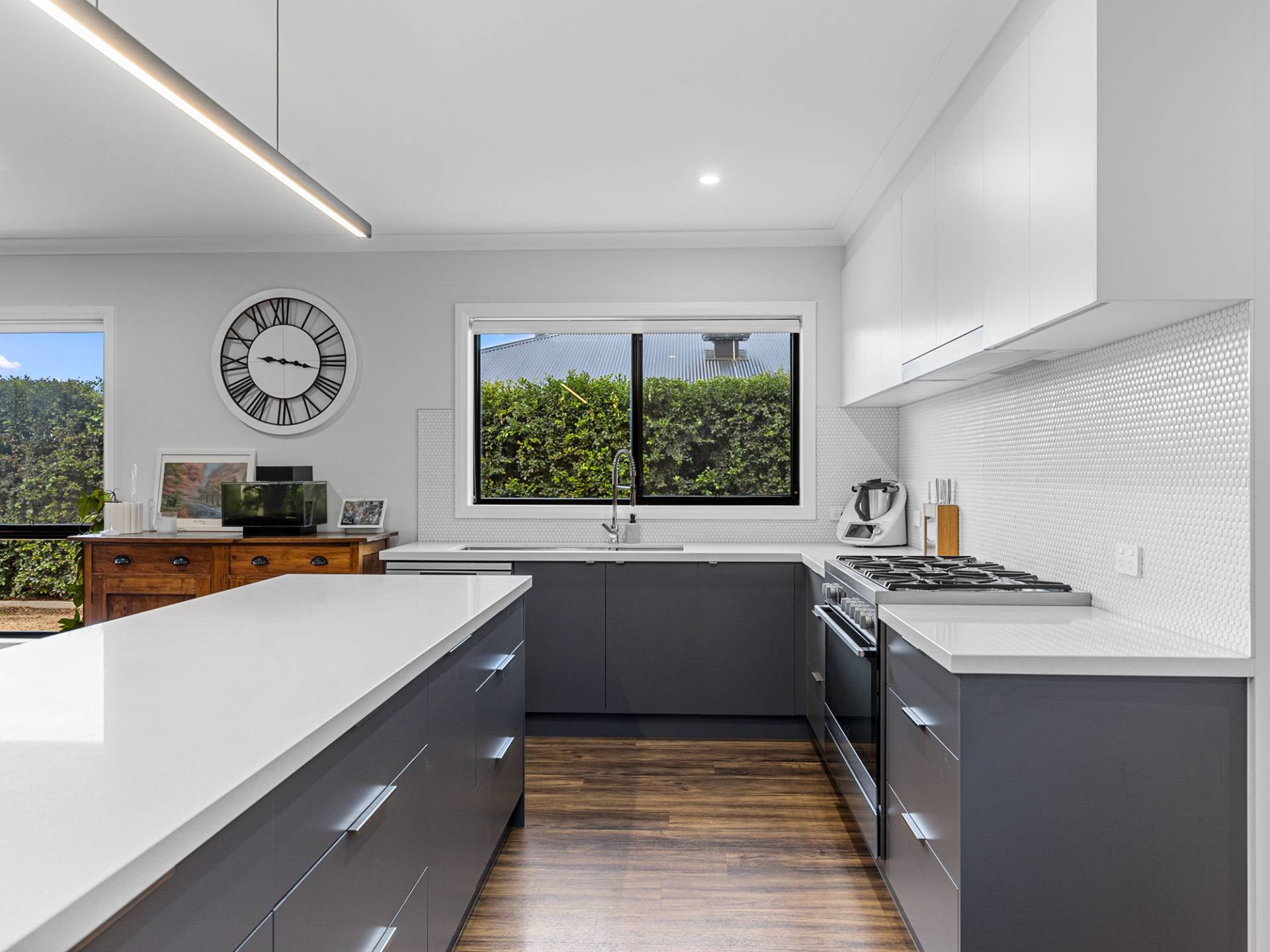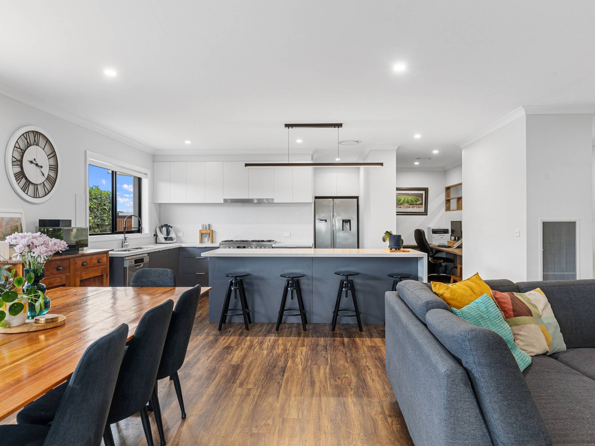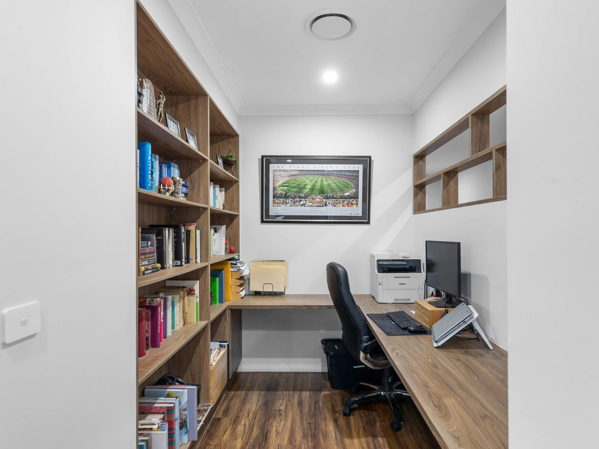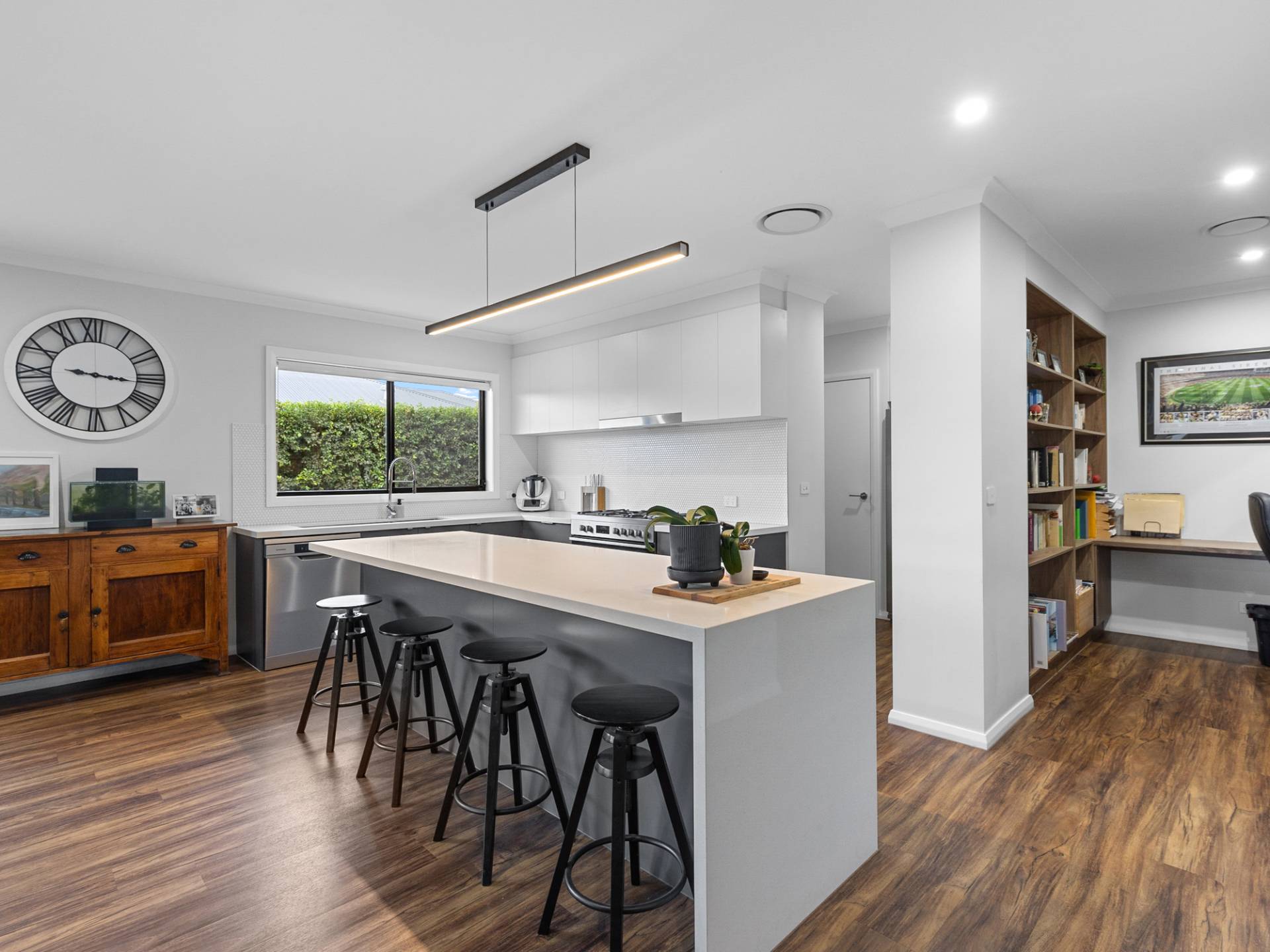 At the heart of the home is a spacious open-plan kitchen, living, and dining area, ideal for family life and entertaining. The kitchen boasts a large stone waterfall island bench, quality appliances, and a generous walk-in pantry that makes every day cooking a pleasure. Adjacent to this is a dedicated study or home office space, complete with built-in desks and shelving, offering a quiet place to work or study.