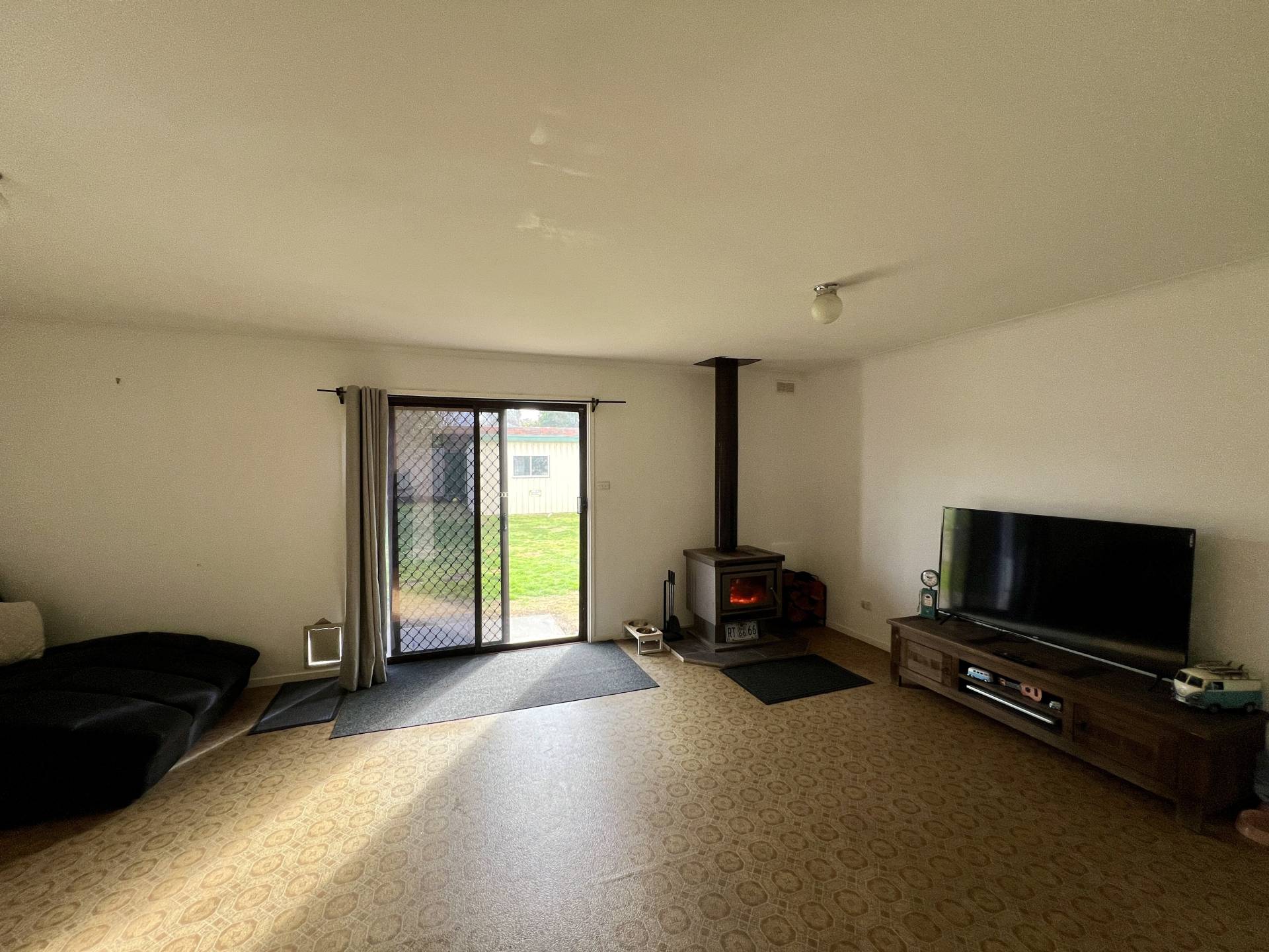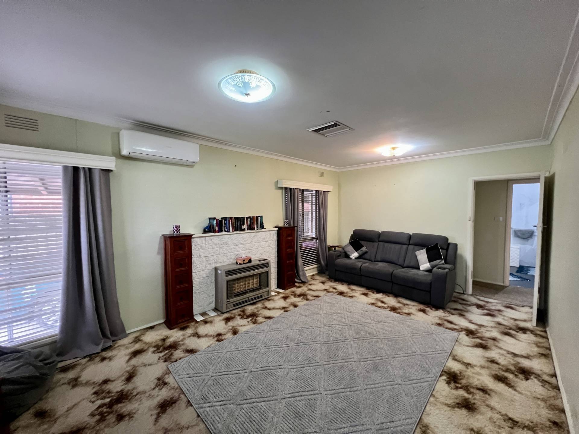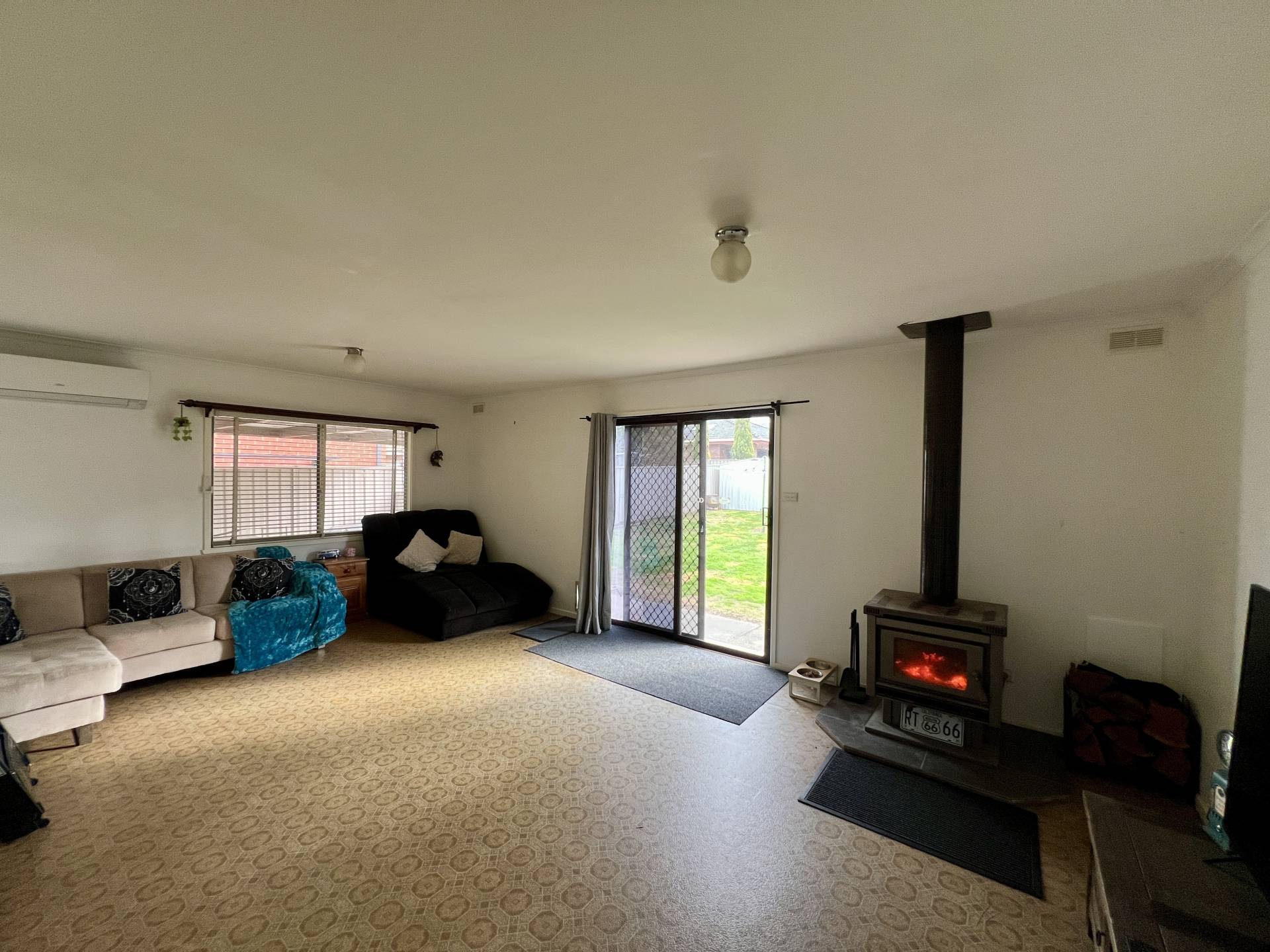 The heart of the home features a modern kitchen equipped with stainless steel appliances and ample cupboard space – perfect for everyday cooking or entertaining. A generous front lounge with split system air conditioning provides a comfortable living zone, while the rear family room (or second lounge) with a cosy solid fuel heater adds flexibility to the floorplan.