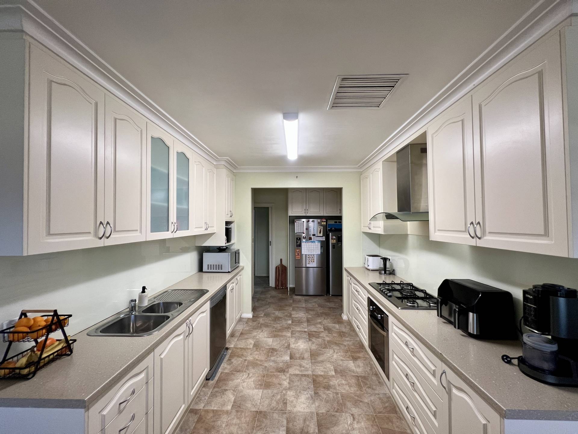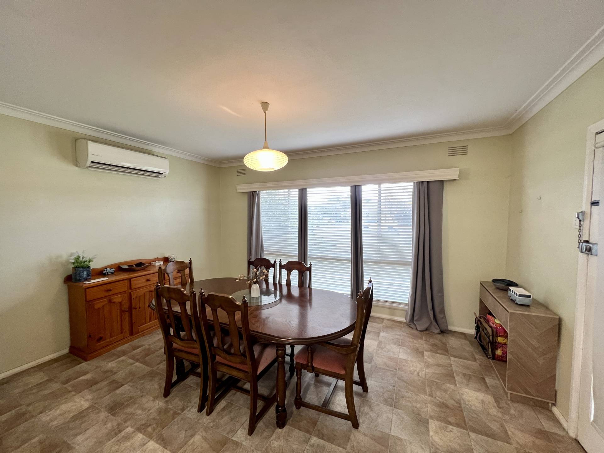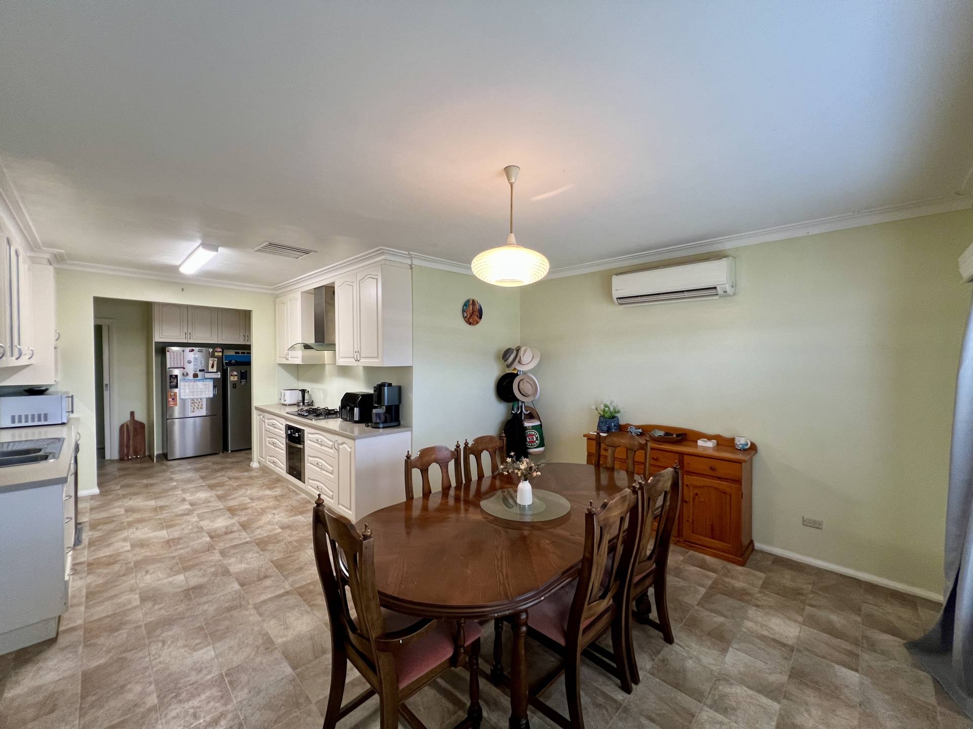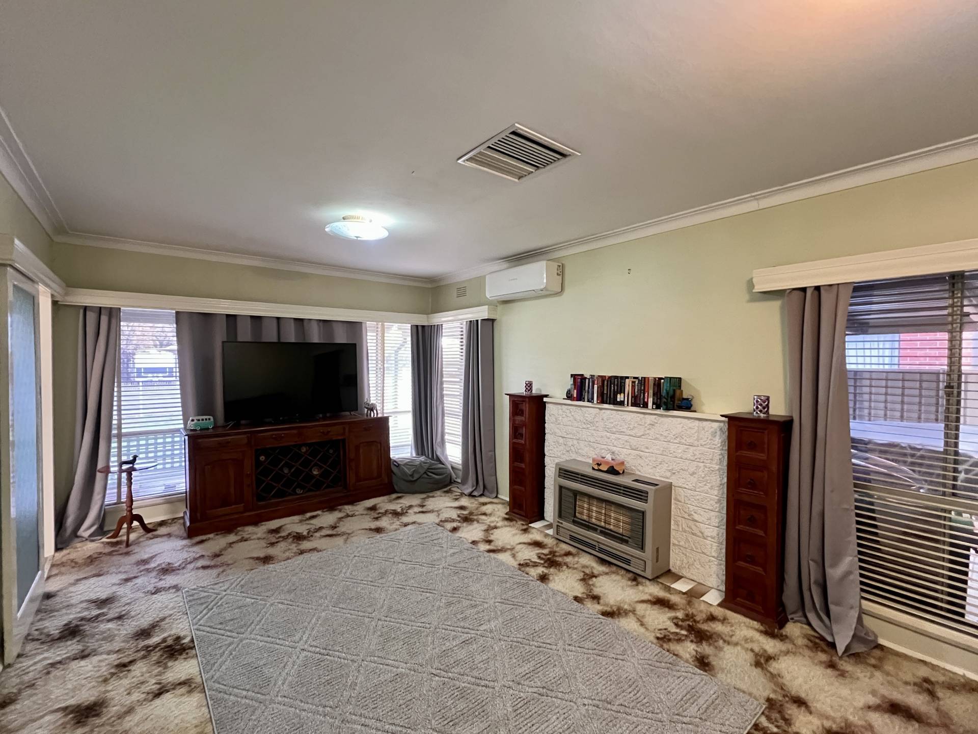 The heart of the home features a modern kitchen equipped with stainless steel appliances and ample cupboard space – perfect for everyday cooking or entertaining. A generous front lounge with split system air conditioning provides a comfortable living zone, while the rear family room (or second lounge) with a cosy solid fuel heater adds flexibility to the floorplan.