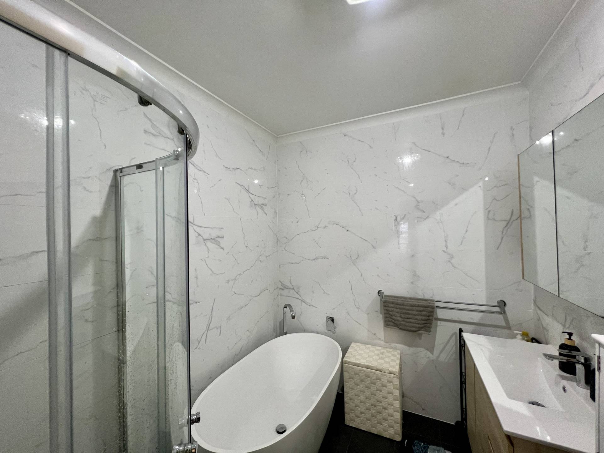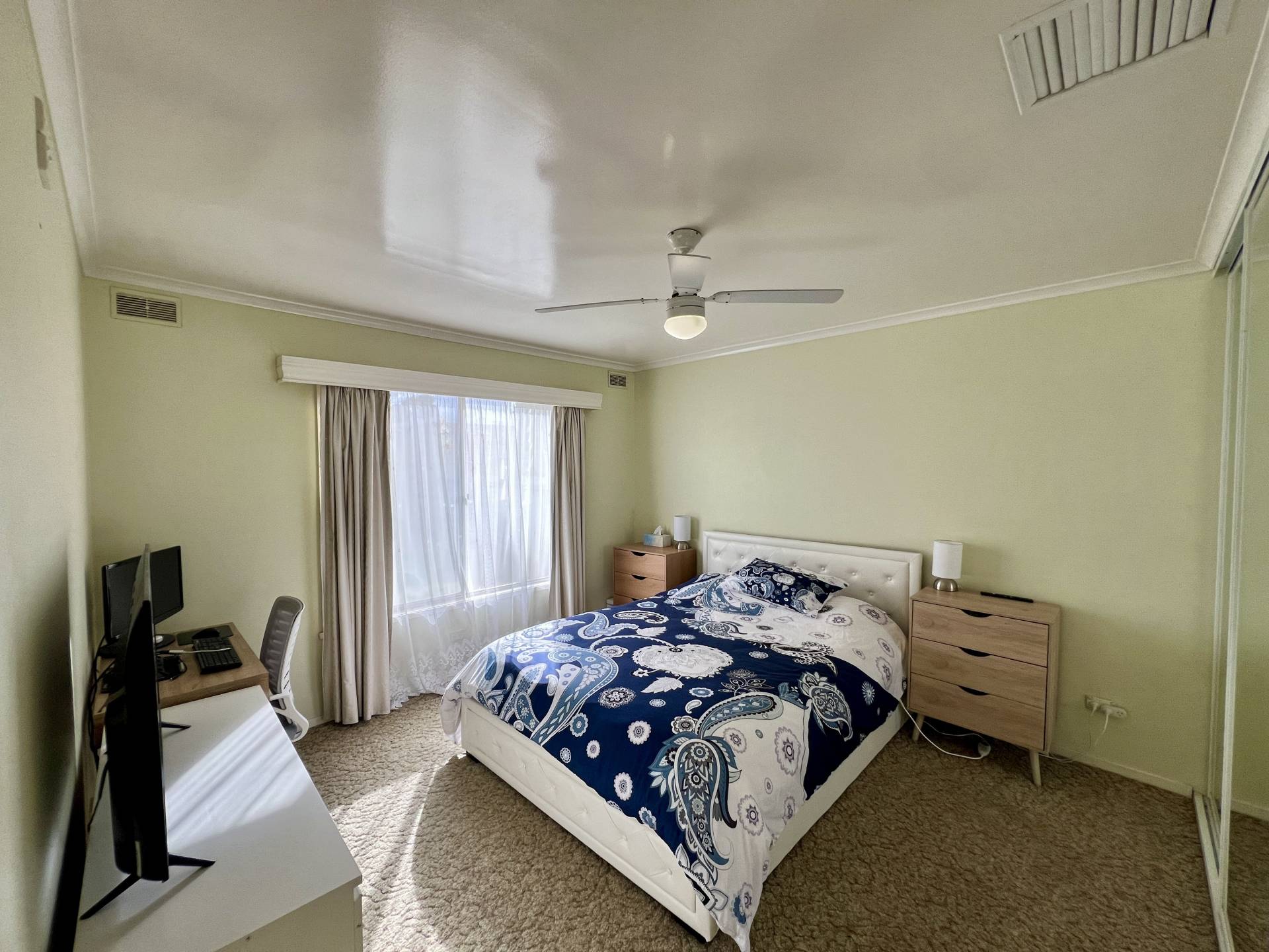 The spacious main bedroom includes built-in robes and ceiling fan, with the remaining two bedrooms also offering built-in robes for added storage. The contemporary bathroom is stylishly finished with floor-to-ceiling tiles, a bathtub, and a separate shower. A separate laundry adds to the functionality of the home.