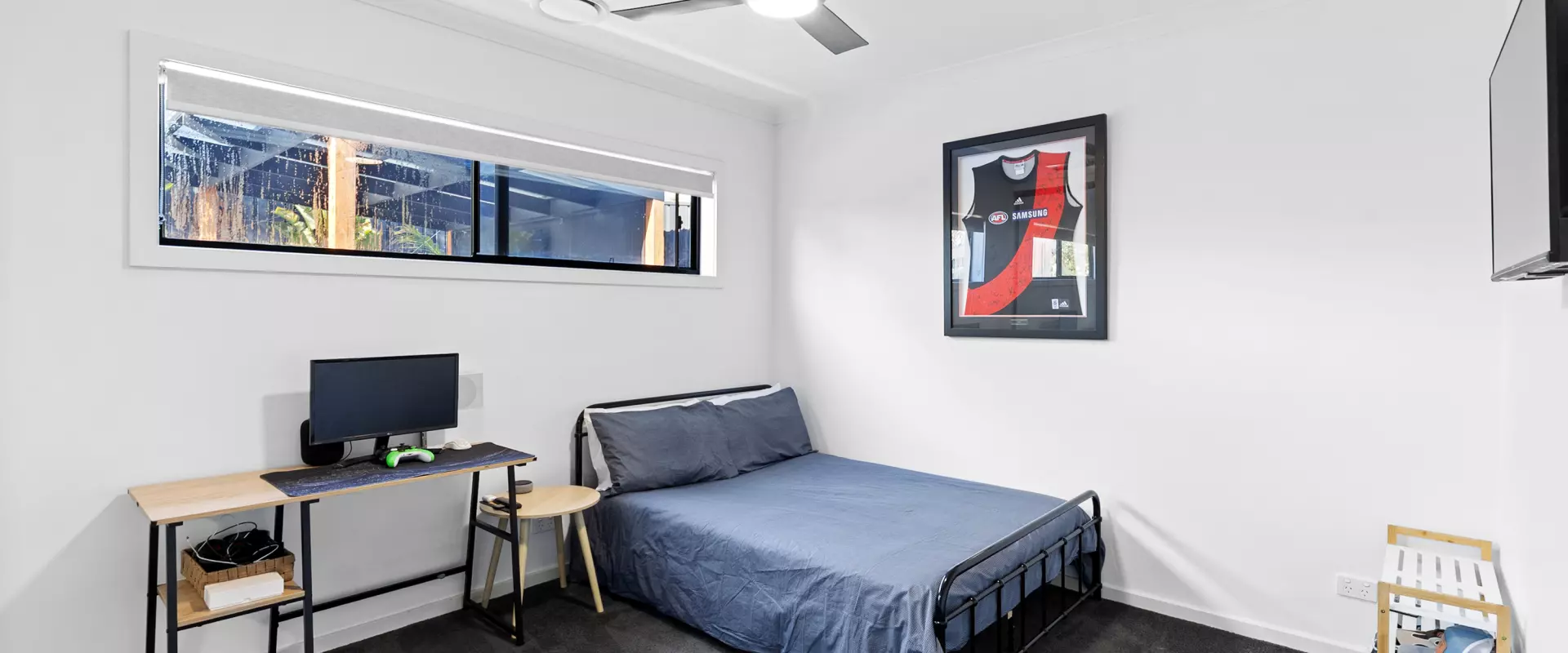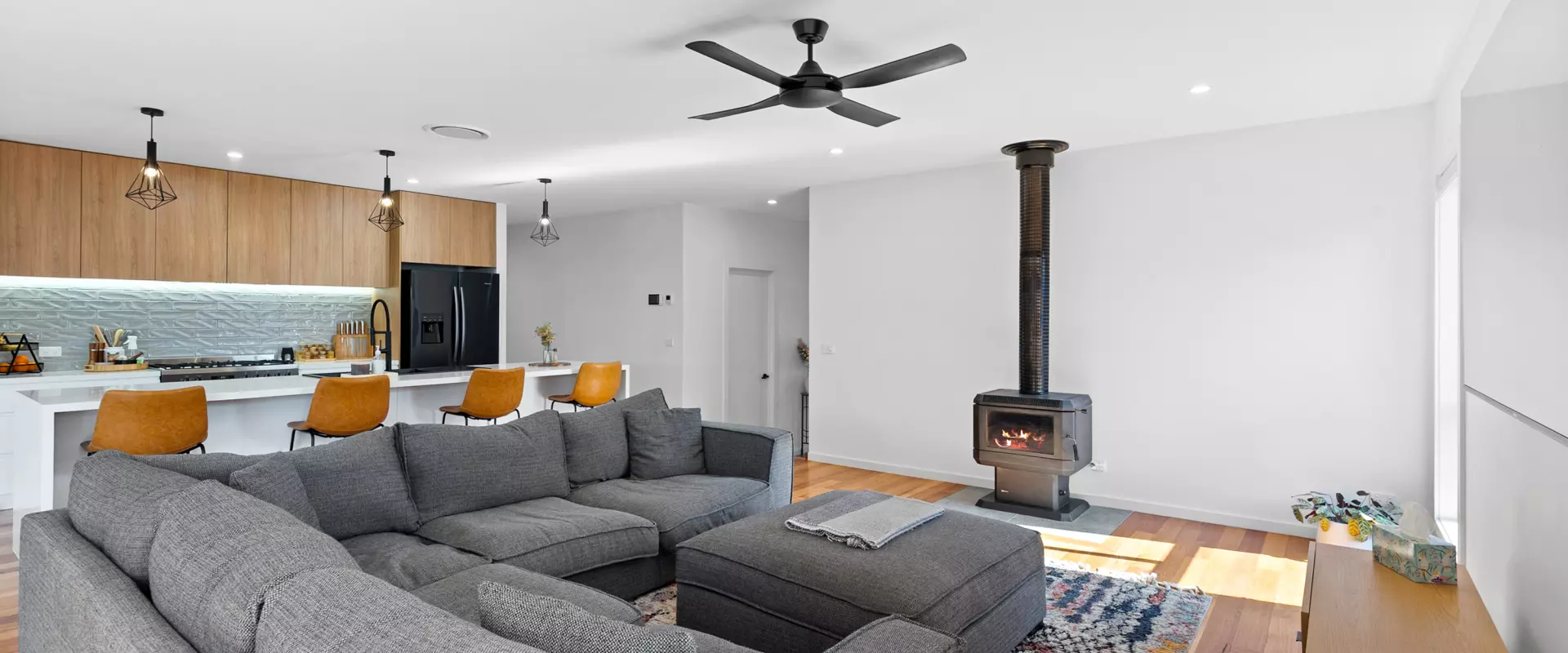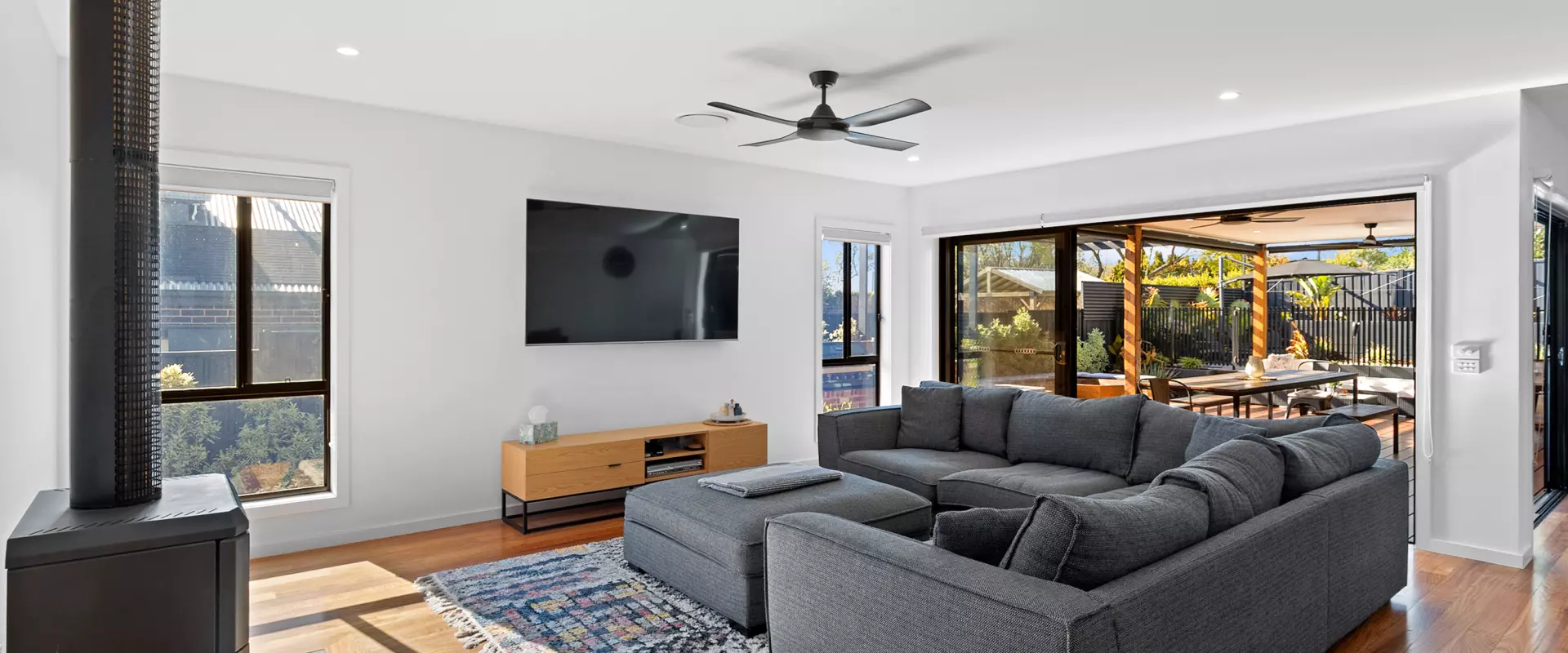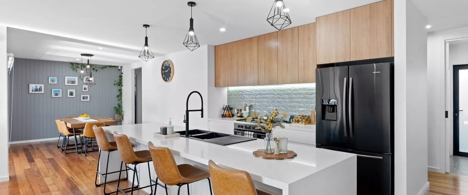 Inside, high ceilings, square set cornices and rich timber floors set the tone for a home that radiates sophistication. The open-plan kitchen, meals, and living area is a stunning space where style meets functionality. The kitchen features stone benchtops with waterfall edges, soft-close cabinetry, a 900mm gas cooktop and oven, dishwasher, LED feature lighting, and a generous butler’s pantry with ample storage and preparation space.