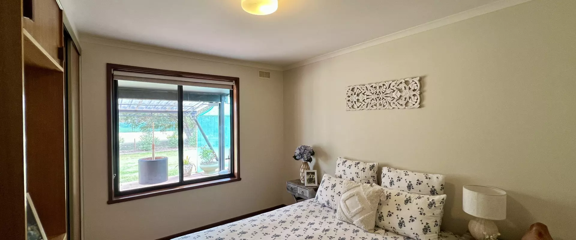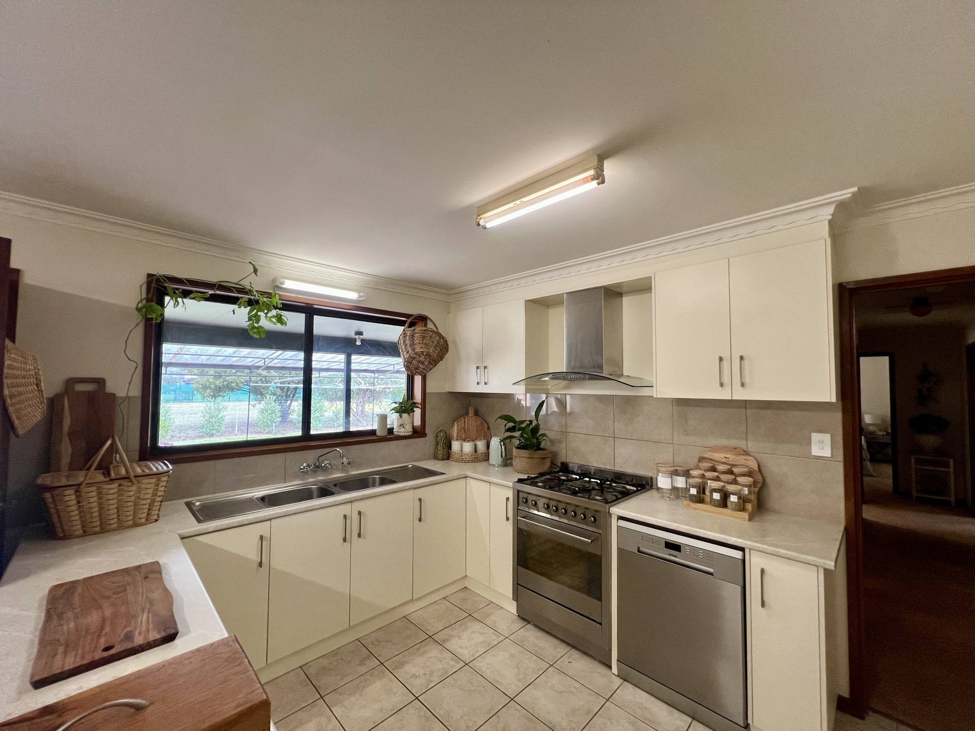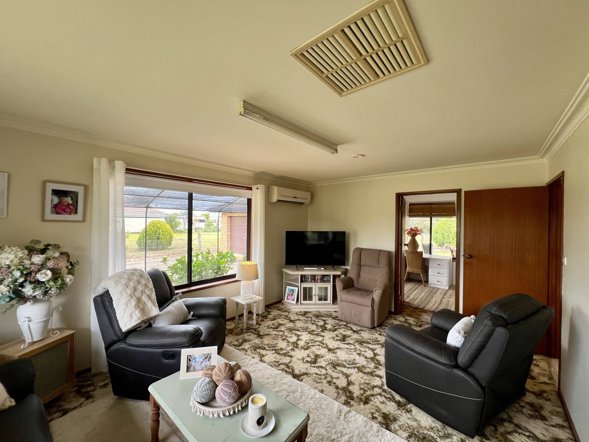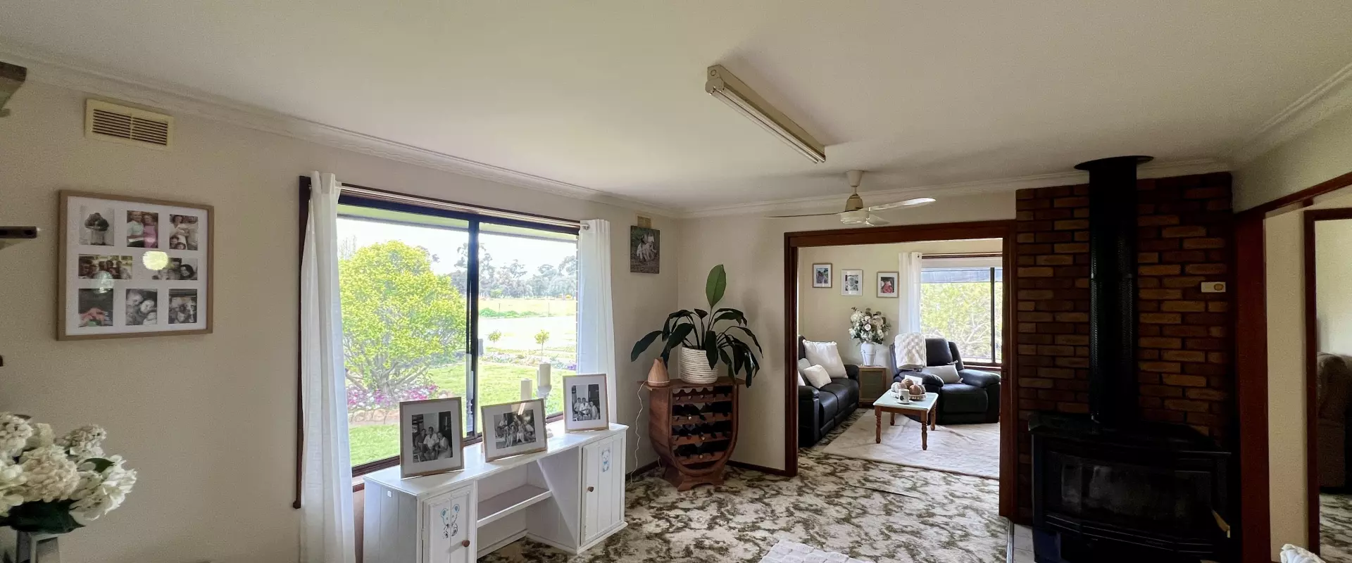 Inside, the home is warm and welcoming, featuring a cosy lounge with solid fuel heater, a light-filled family room with split system, and a well-equipped kitchen with updated appliances and plenty of storage. Four generous bedrooms with built-in robes provide room for the whole family, while fresh carpet, evaporative cooling, floor heating, and solar power add everyday comfort and efficiency.
