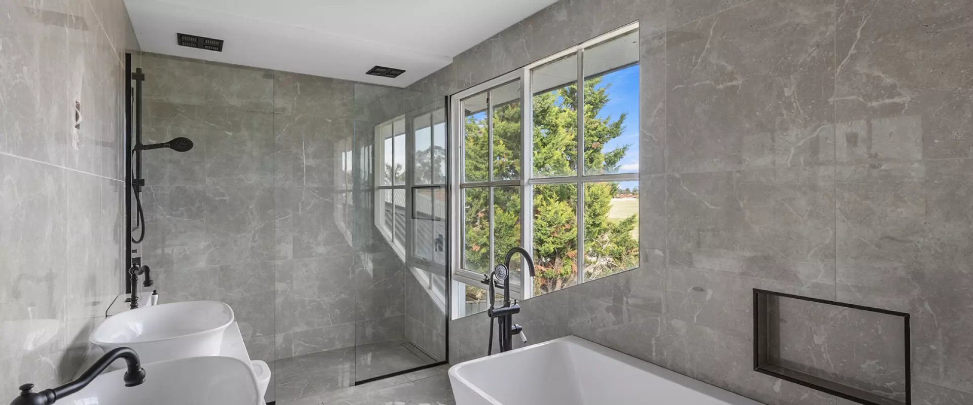 The main bedroom is conveniently located downstairs and includes a walk-in robe and private ensuite and bay window, while the laundry offers generous storage and a separate toilet for added practicality. Upstairs, you’ll find four spacious bedrooms, each with built-in robes, along with a contemporary main bathroom complete with a double vanity, double shower, and bathtub.