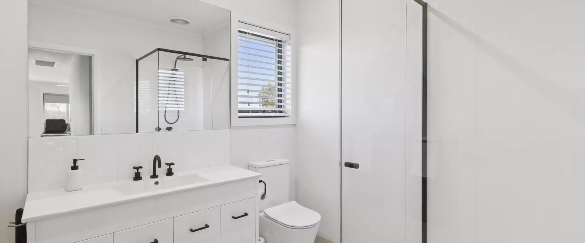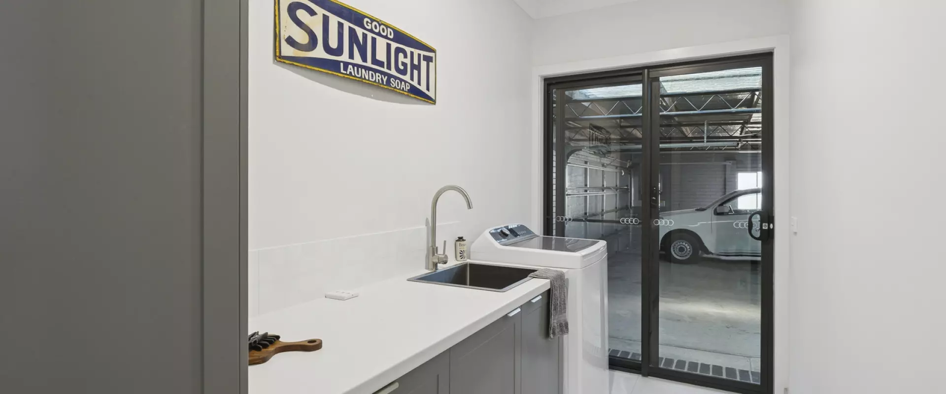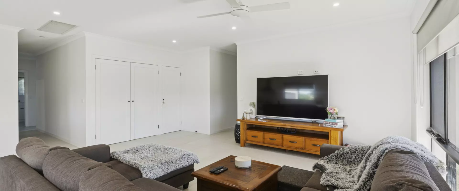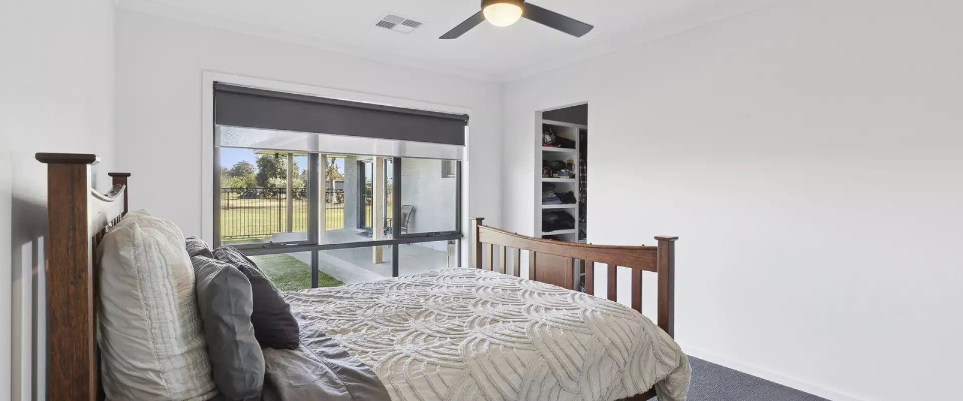 Additional highlights include a sleek main bathroom with shower and toilet, a modern laundry with built-in cabinetry and stainless-steel trough, and refrigerated AC and double glazed windows throughout the home for year-round comfort, while the solar panels further help keep costs down.