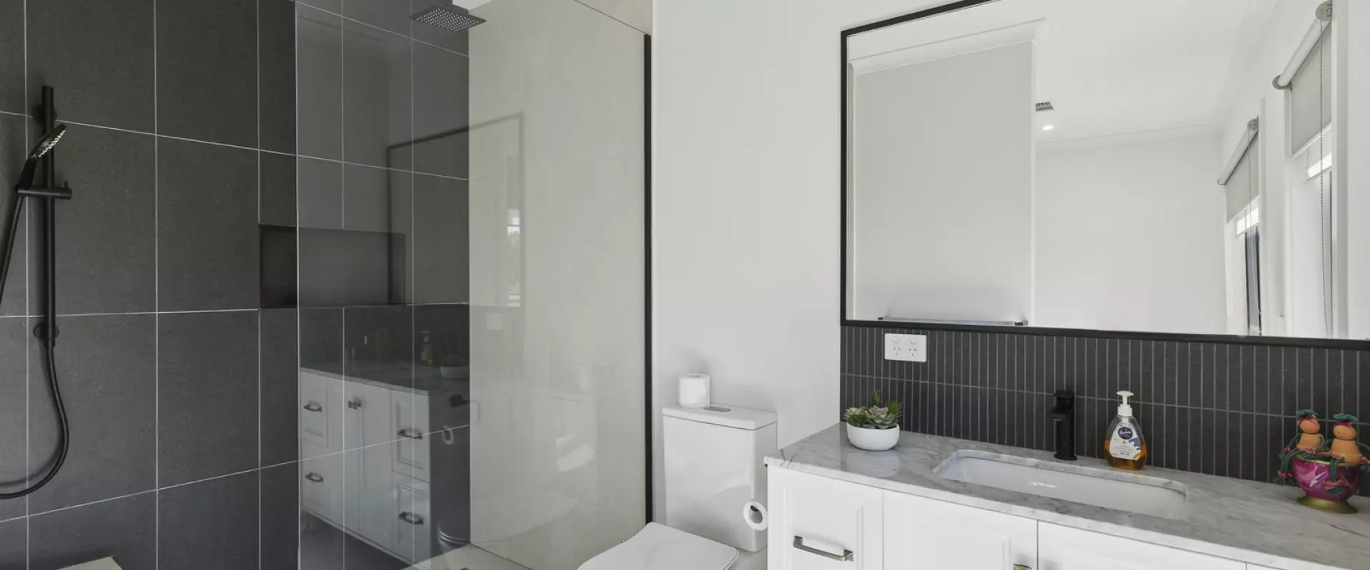 The spacious master bedroom includes a walk-in robe and stylish ensuite complete with a stone vanity, tiled walk-in shower, and toilet. The remaining three bedrooms are all generous in size, two with built-in robes and one with a walk-in robe, all equipped with ceiling fans for comfort.