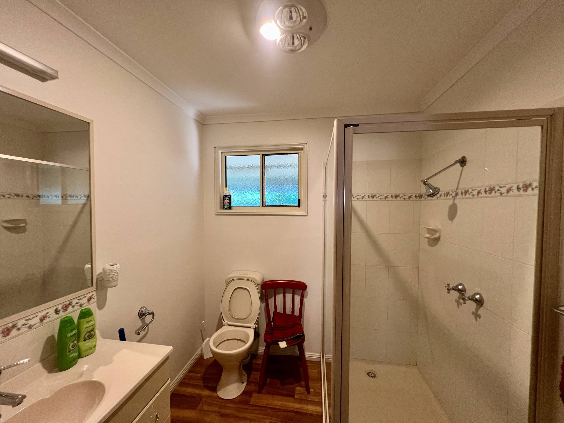 The master bedroom boasts a walk-in robe and a private ensuite, while the remaining two bedrooms include built-in robes and ceiling fans. The main bathroom is equipped with a shower and toilet, and a generous laundry adds to the functionality of the home.