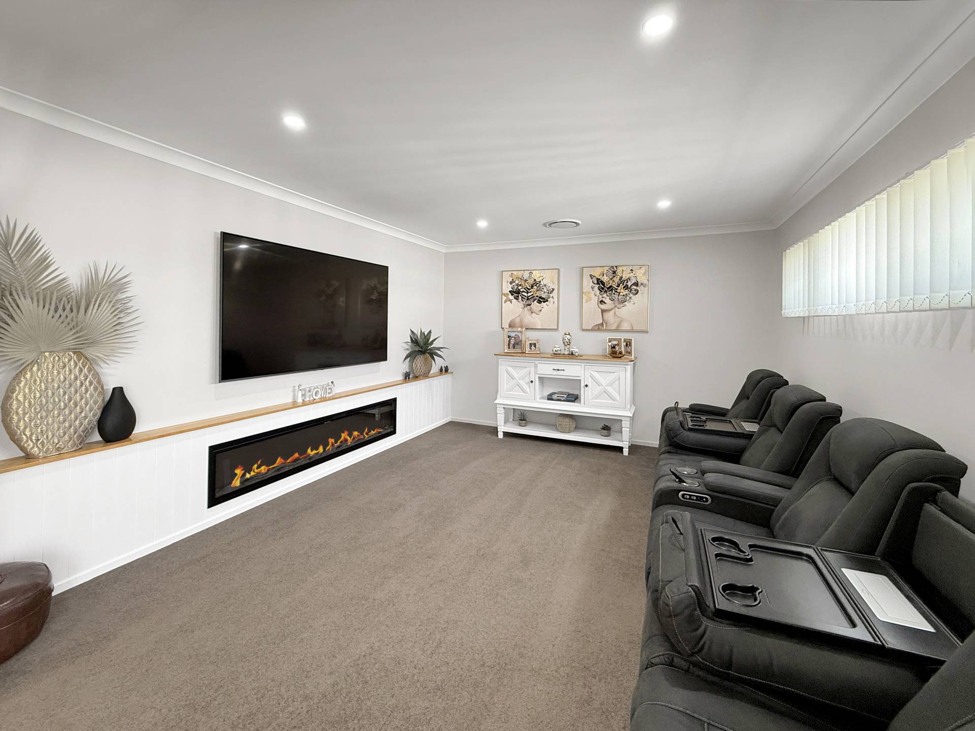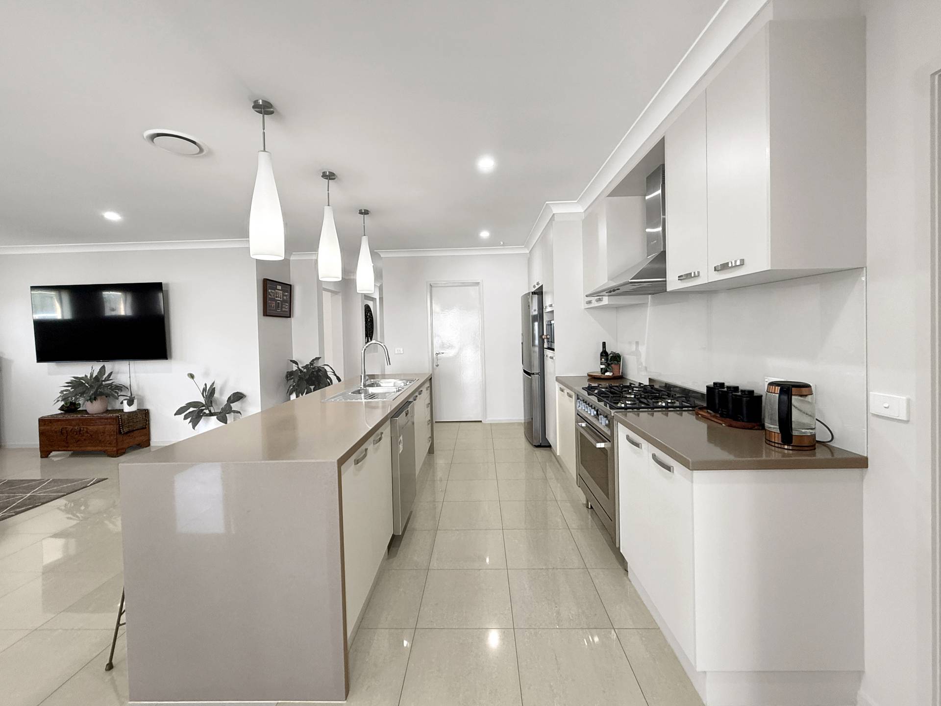 Designed for effortless family living and entertaining, the home features multiple living zones, including a large open-plan kitchen, meals, and family area, and a separate lounge with a feature electric log fireplace. The kitchen is sensational, boasting stone benchtops with waterfall edges, a 900mm gas cooktop and oven, dishwasher and a walk-in pantry that will delight any home chef.