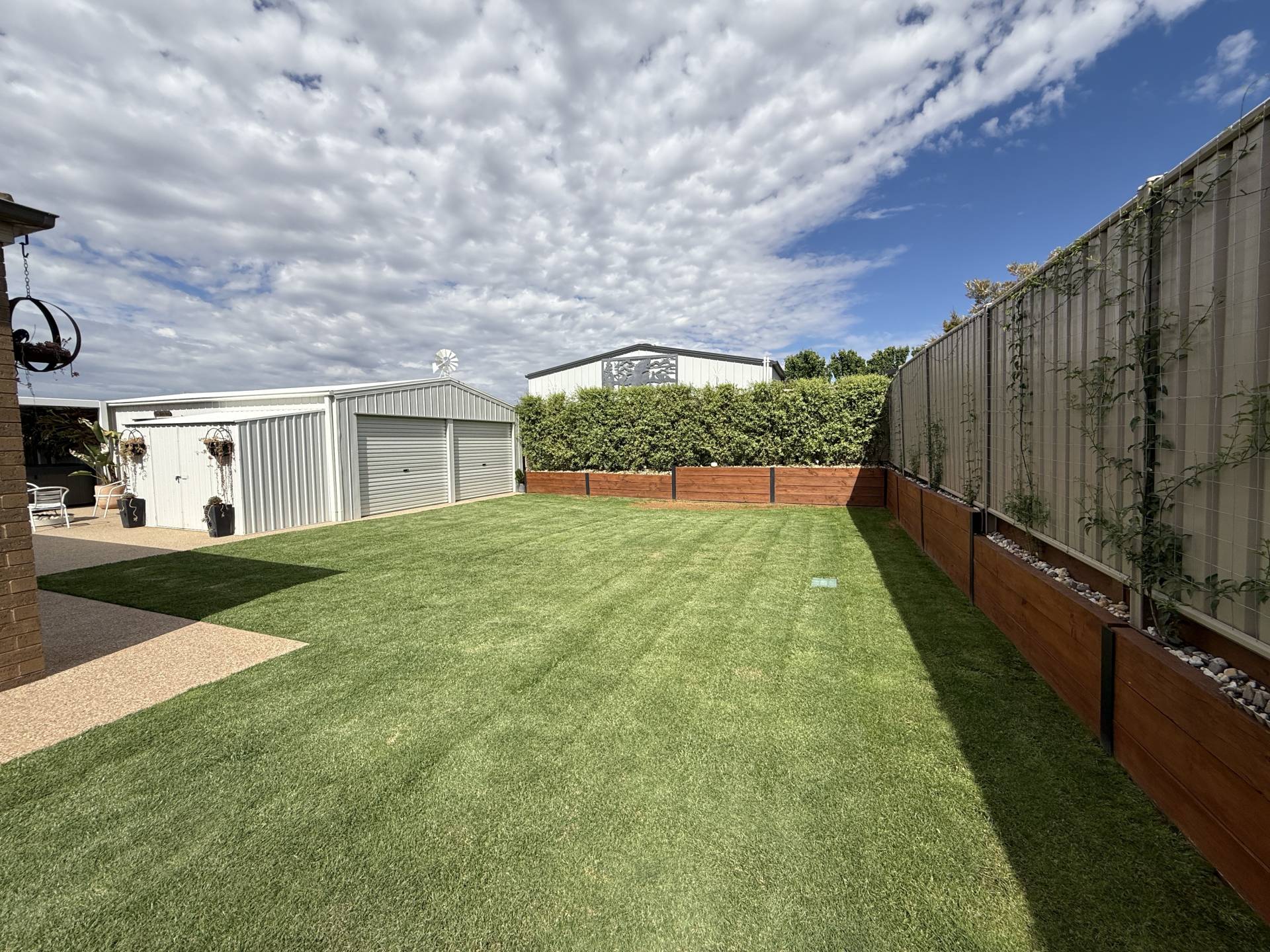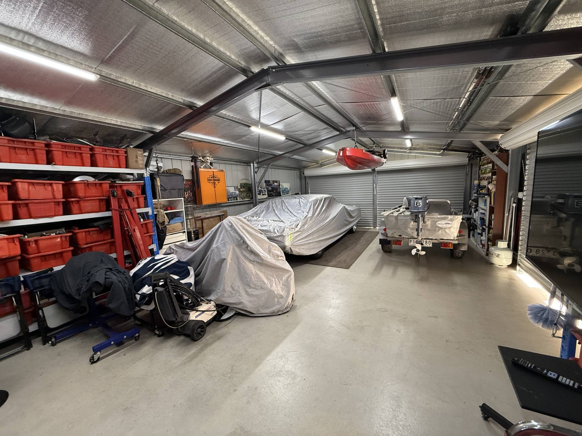• 10m x 6m powered shed with concrete floor, and three roller doors