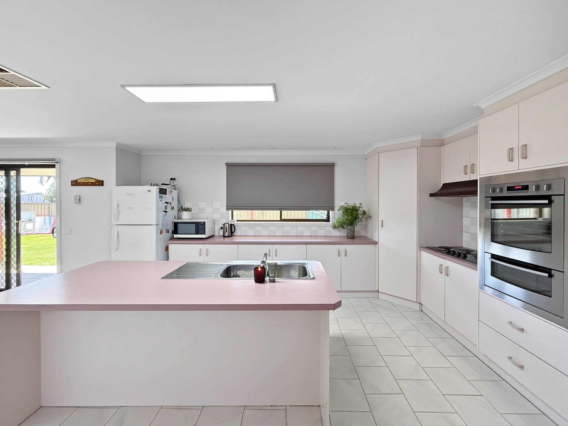 Designed with families in mind, it features two inviting living areas, including a gorgeous front lounge with a cedar-lined raked ceiling. The second living area sits beside the spacious kitchen-meals zone, equipped with an electric cooktop, oven and dishwasher.