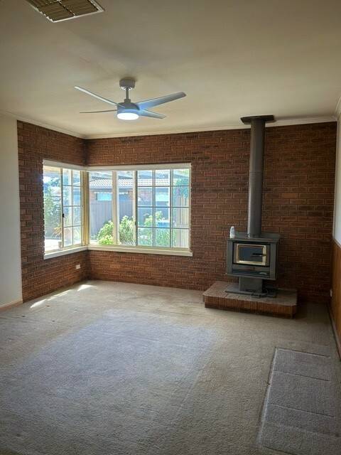 Inside features a separate loungeroom with a cosy wood-fire heater, plus evaporative cooling throughout. The open kitchen/meals area includes a gas cooktop, oven, dishwasher and gas heating.