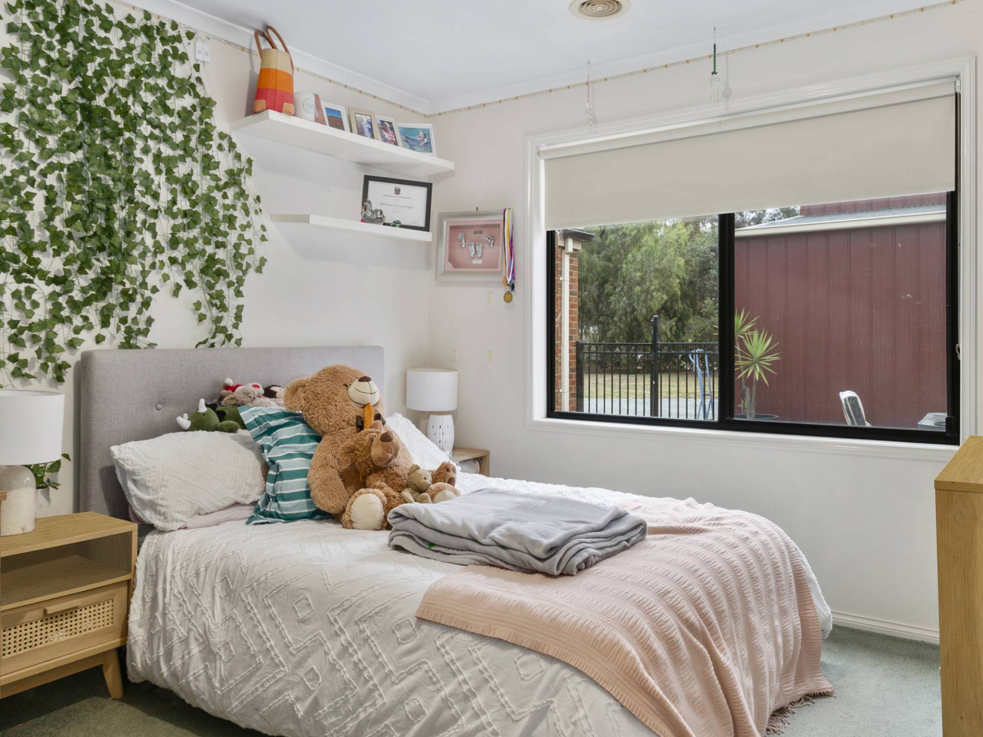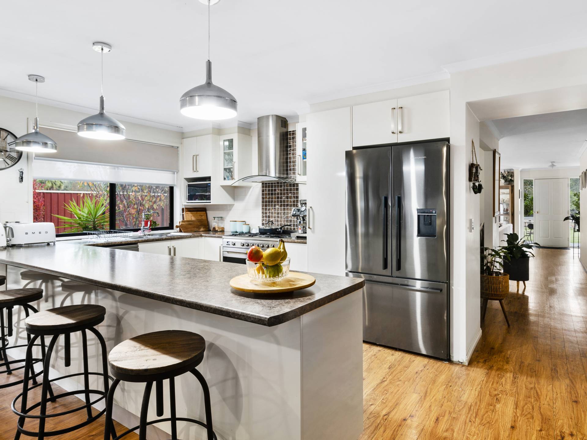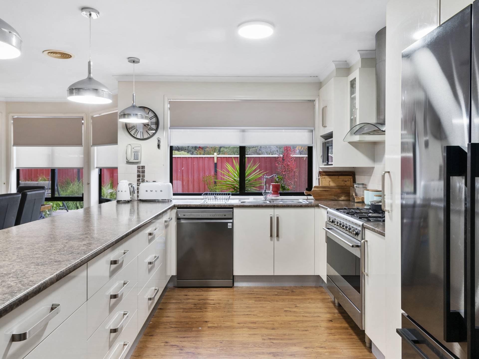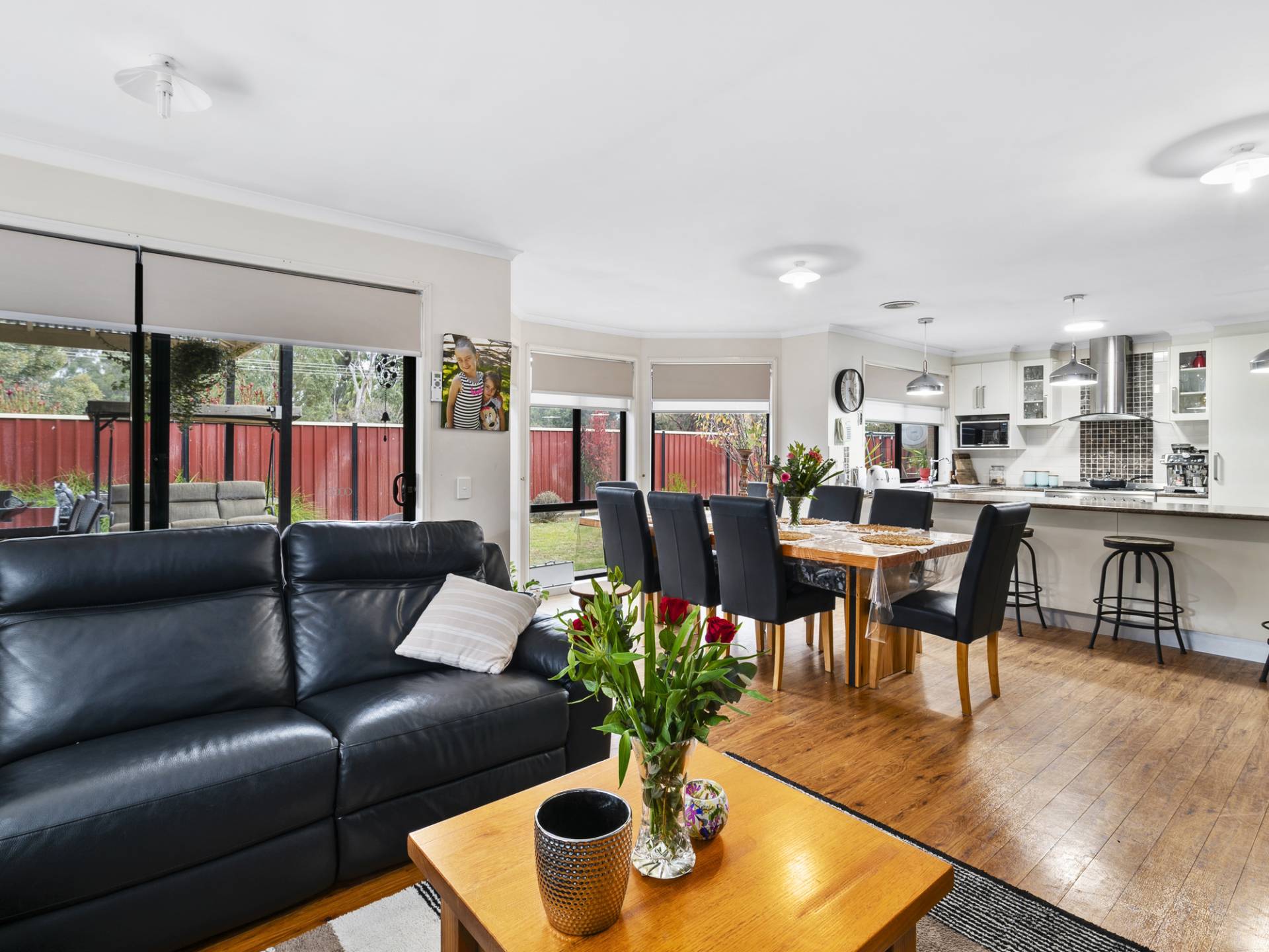 The well-appointed kitchen features a generous breakfast bar, stainless steel oven and excellent storage, flowing seamlessly into the open-plan living area. With a charming bay window, split system air conditioner and sliding doors opening to the covered outdoor entertaining space, it’s an ideal setting for relaxed family living. A separate front lounge provides additional room to unwind or retreat.