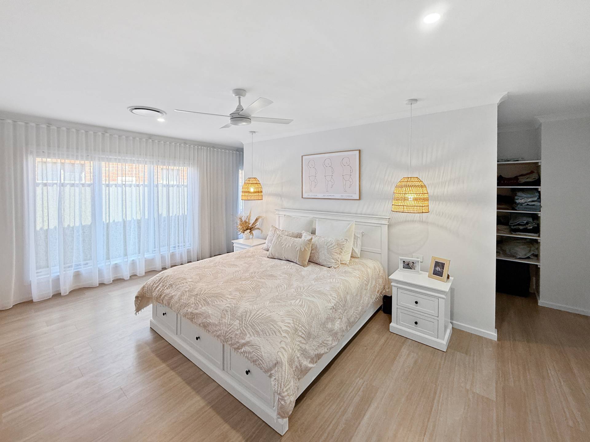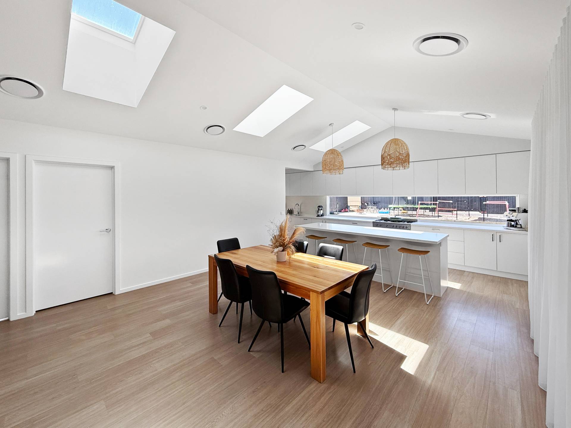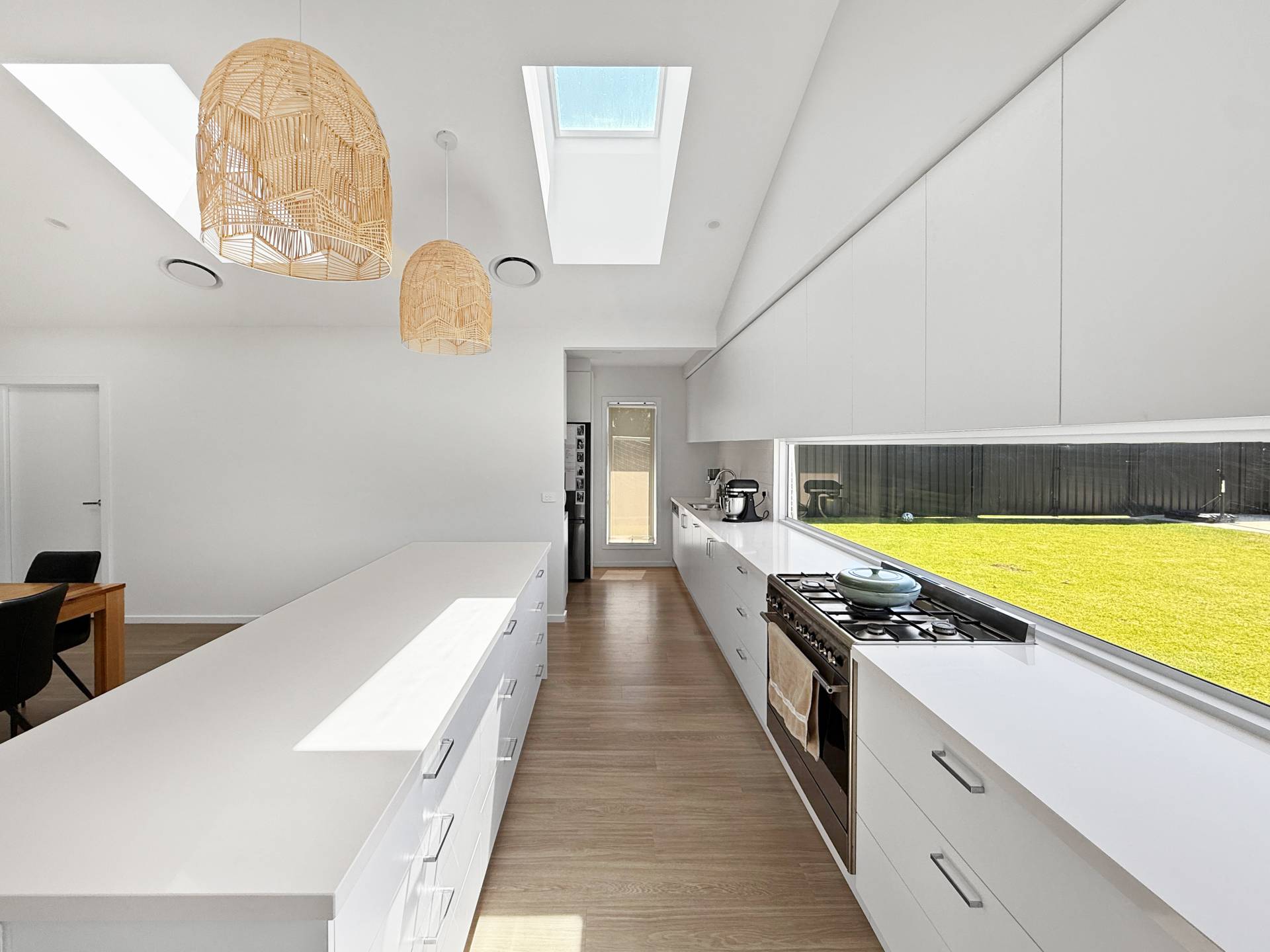The stunning designer kitchen features beautiful stone benchtops, an undermount double sink, 900mm gas cooktop and oven, with a peaceful outlook over the backyard, perfect for entertaining while keeping an eye on the kids. It flows effortlessly into a butler’s pantry with wrap-around storage and a cleverly hidden fridge provision.