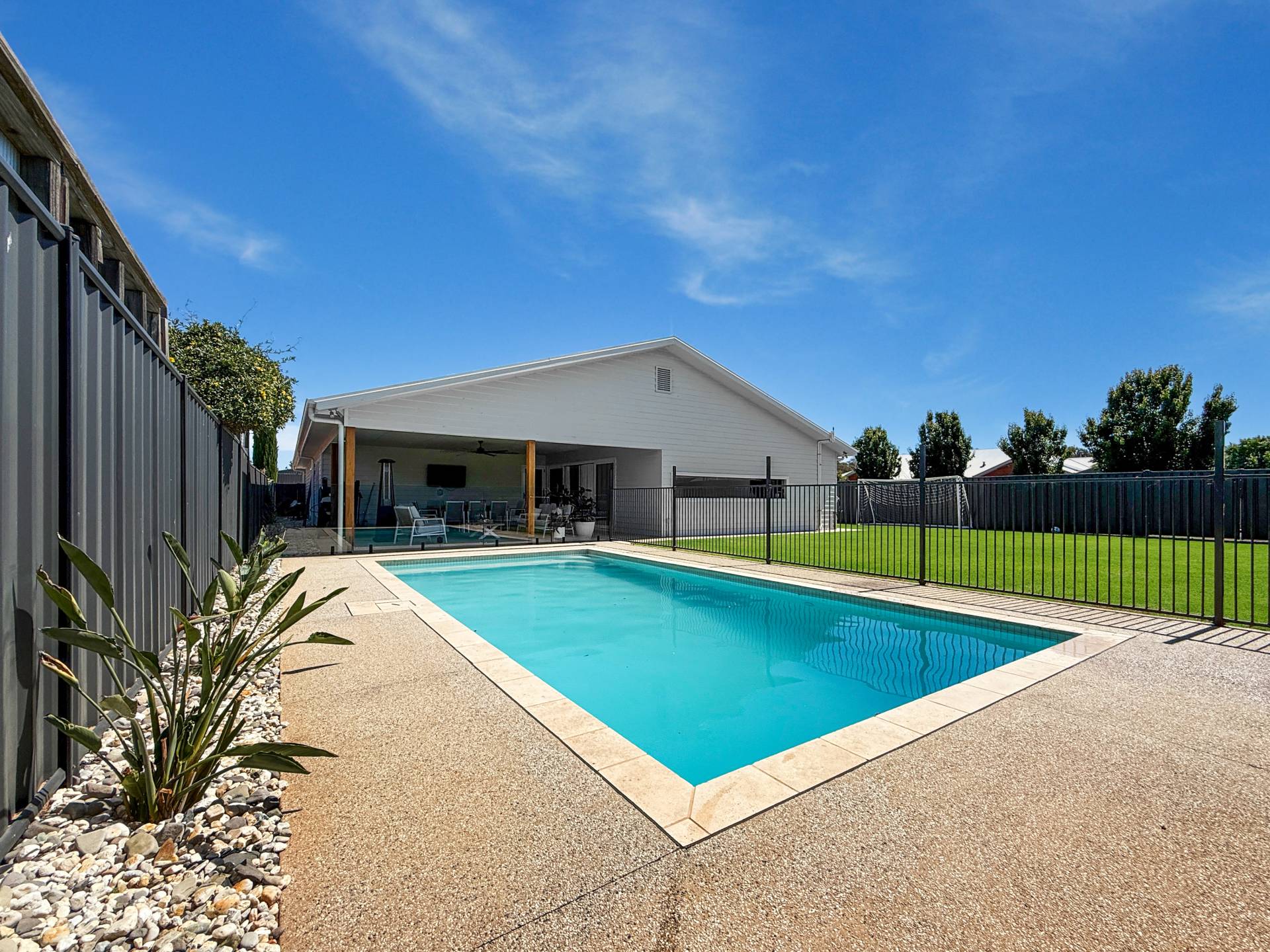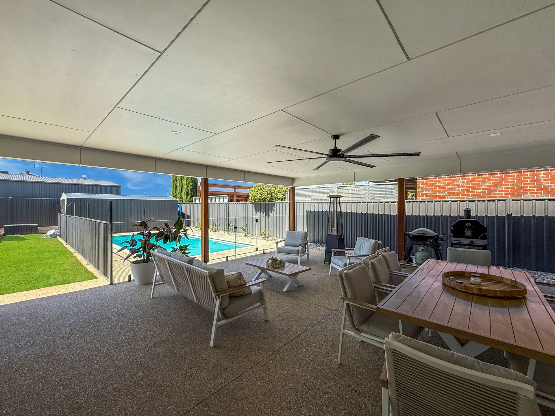Outdoors is an entertainer’s paradise, with a huge undercover alfresco area overlooking the impressive 8.4m magnesium solar-heated concrete pool and generous backyard. The backyard is enhanced by a kids’ play zone, firepit area, rear vehicle access and a 6x3m shed.