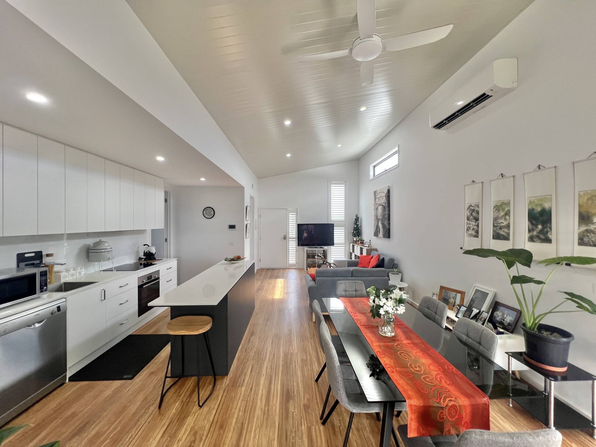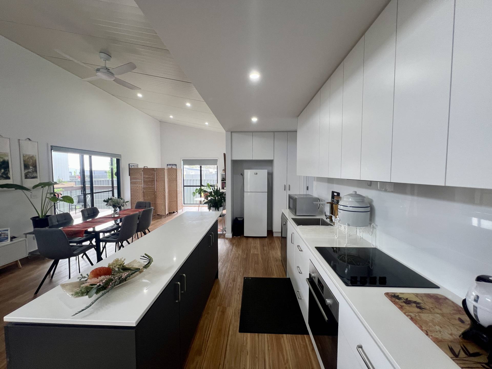 The home features a brilliant open-plan design, filled with natural light throughout. The contemporary kitchen is well appointed with stone benchtops, electric cooking, a large island bench and ample cupboard space, making it both practical and inviting.