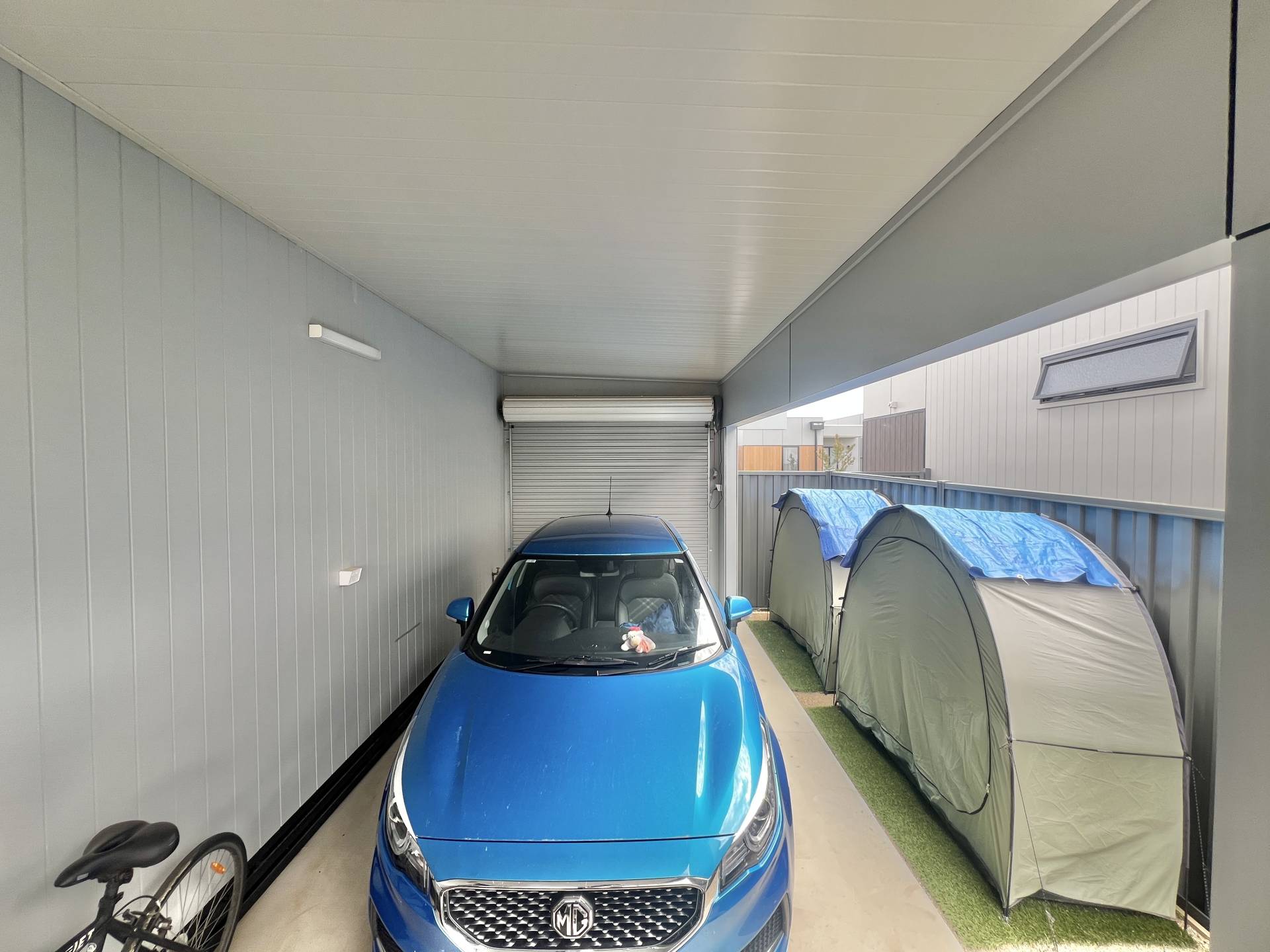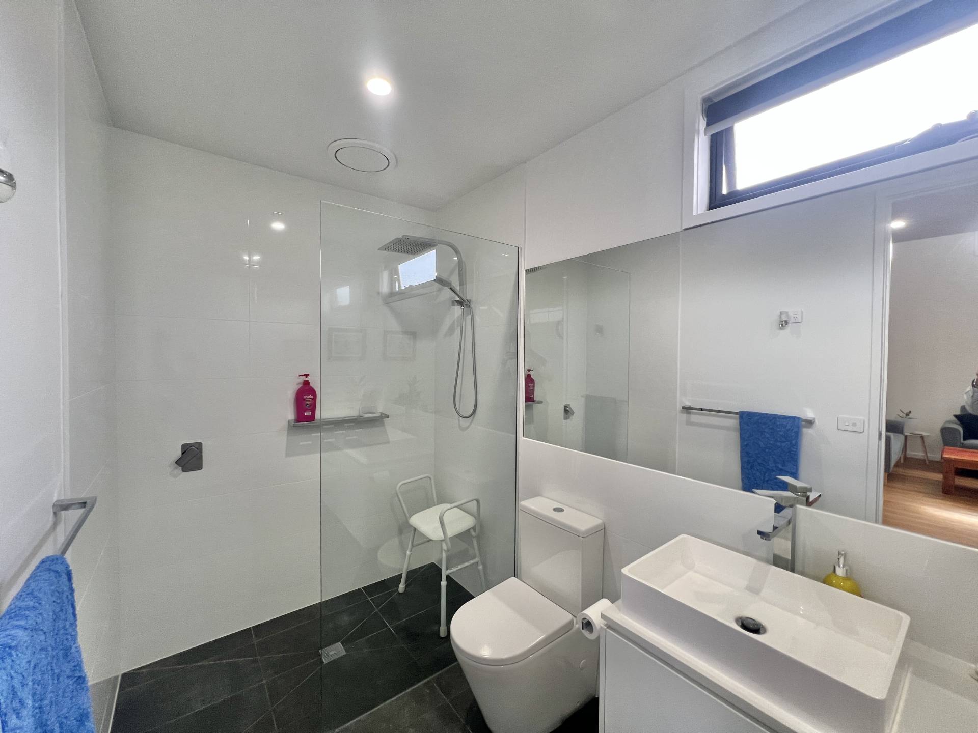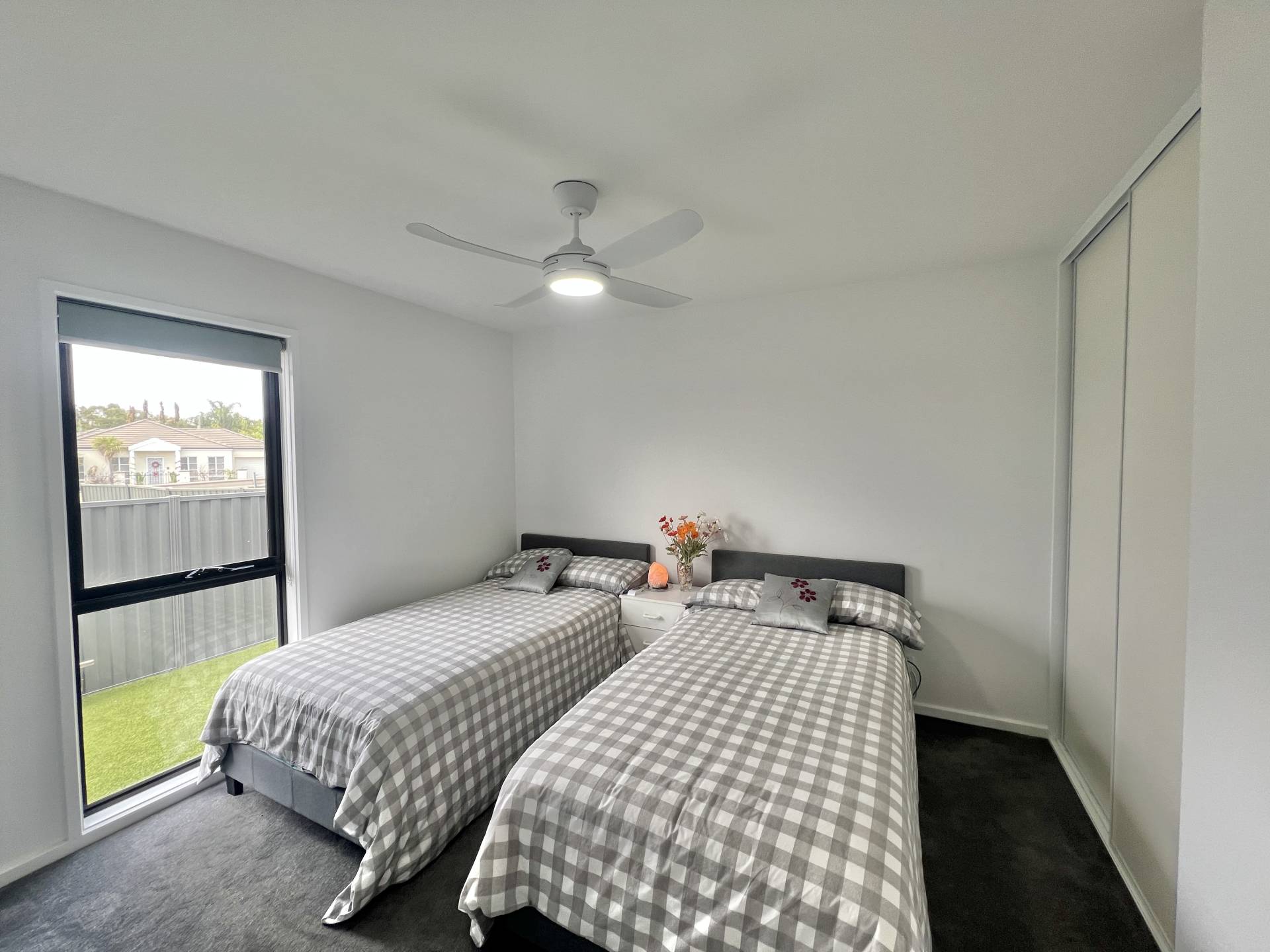 The generous master bedroom includes built-in robes, a ceiling fan and plantation shutters, while the second bedroom is also well sized and fitted with built-in robes and a ceiling fan. The modern bathroom is finished with tiled flooring, a large tiled walk-in shower, floating vanity with stone benchtop and toilet. A separate laundry adds further convenience.