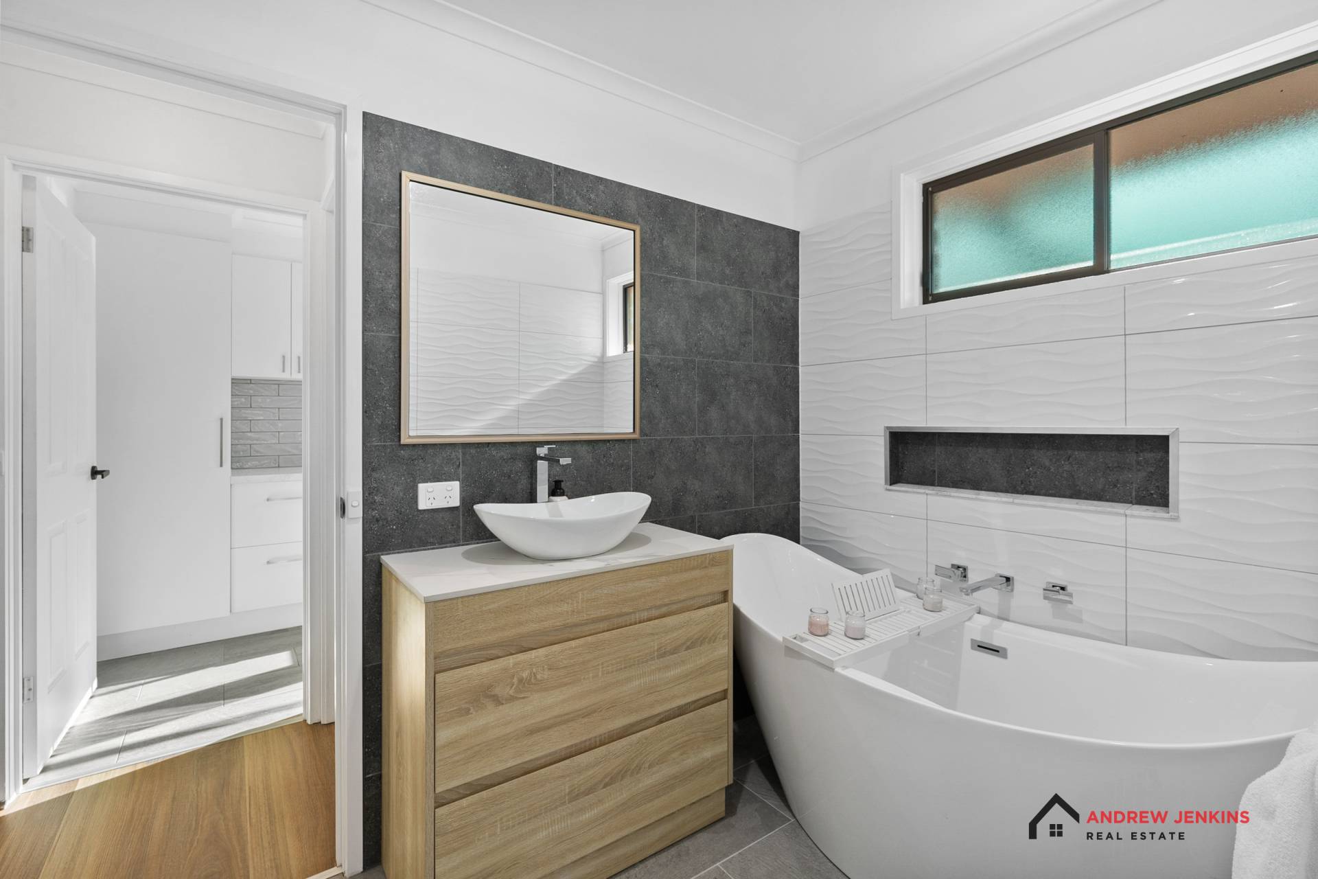 The master bedroom is a true retreat with built-in robes, a ceiling fan, its own split system air conditioner, and walk-through access to the main bathroom. The bathroom itself is beautifully appointed with quality tiled flooring, a large tiled shower recess, freestanding bath, stone-top vanity, and a separate toilet. The additional two bedrooms are also fitted with built-in robes, offering ample storage for the whole family.